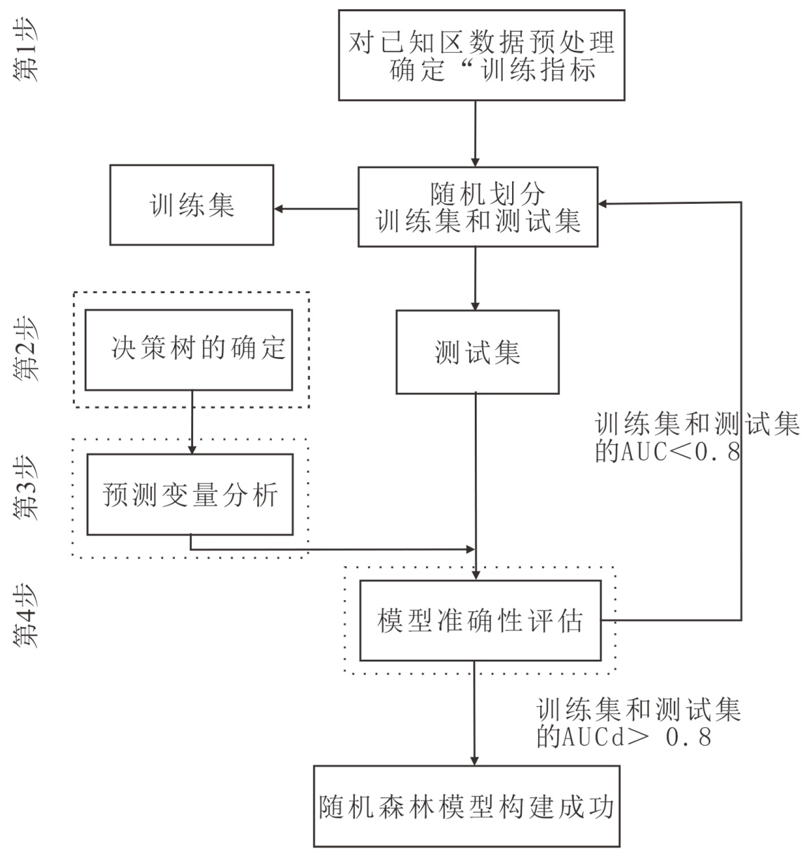 数据预处理与特征选择:对已知区地电化学数据进行因子分析和R型聚类分析。结果显示,Li、Rb、Cs、Th元素在F1因子上具有高载荷(>0.5),且R型聚类也将其归为一类。这与锂辉石伟晶岩矿床的典型元素共生组合(Li、Rb、Cs同属碱金属,地球化学性质相似)相符。因此,确定以Li、Rb、Cs、Th的单元素含量及其组合因子F1的得分作为模型的“训练指标”[16],模型构建流程见图3。