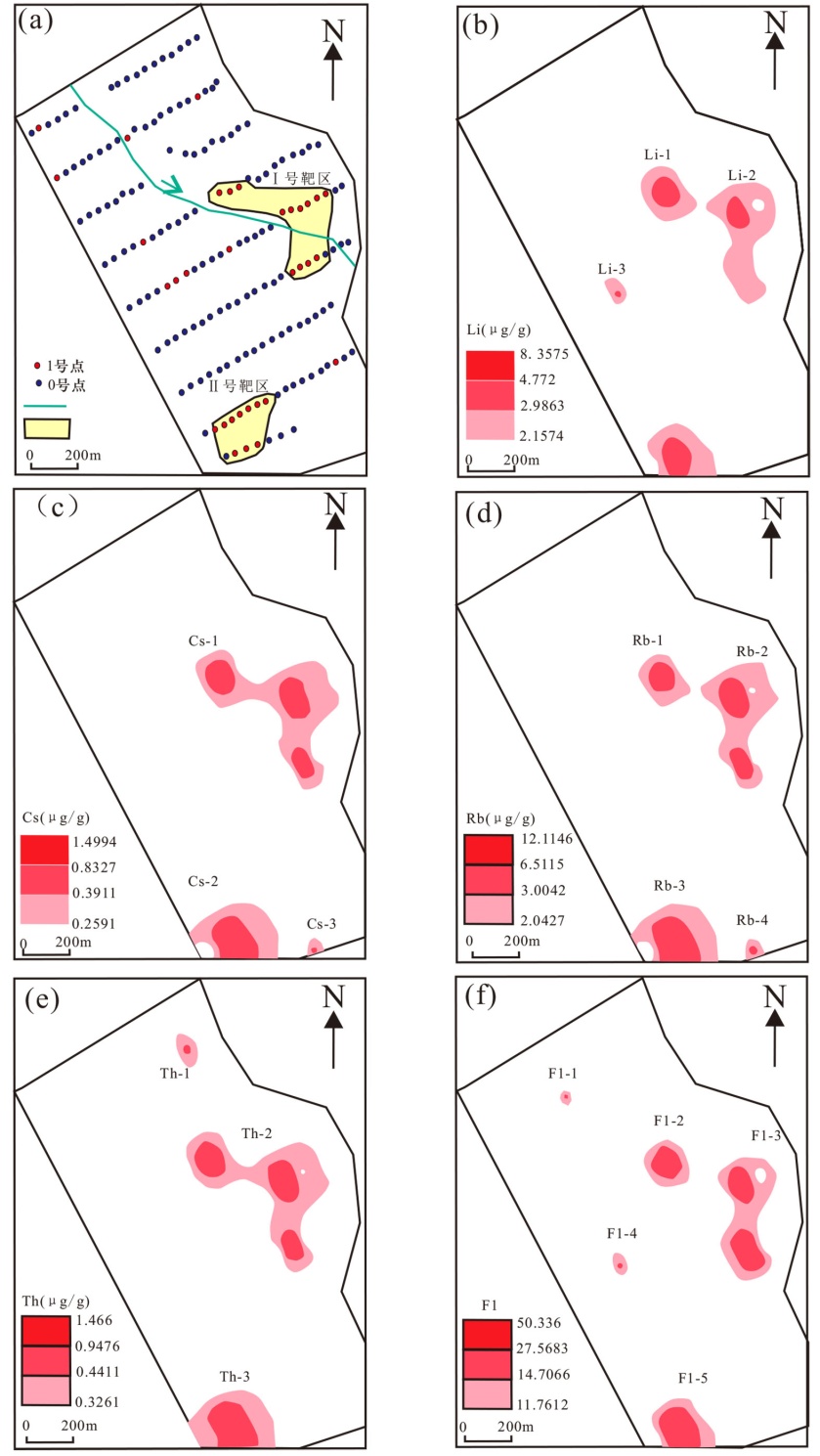 图4. 随机森林预测的找矿靶区和Li、Cs、Rb、Th单元素、F1组合元素验证图[16]