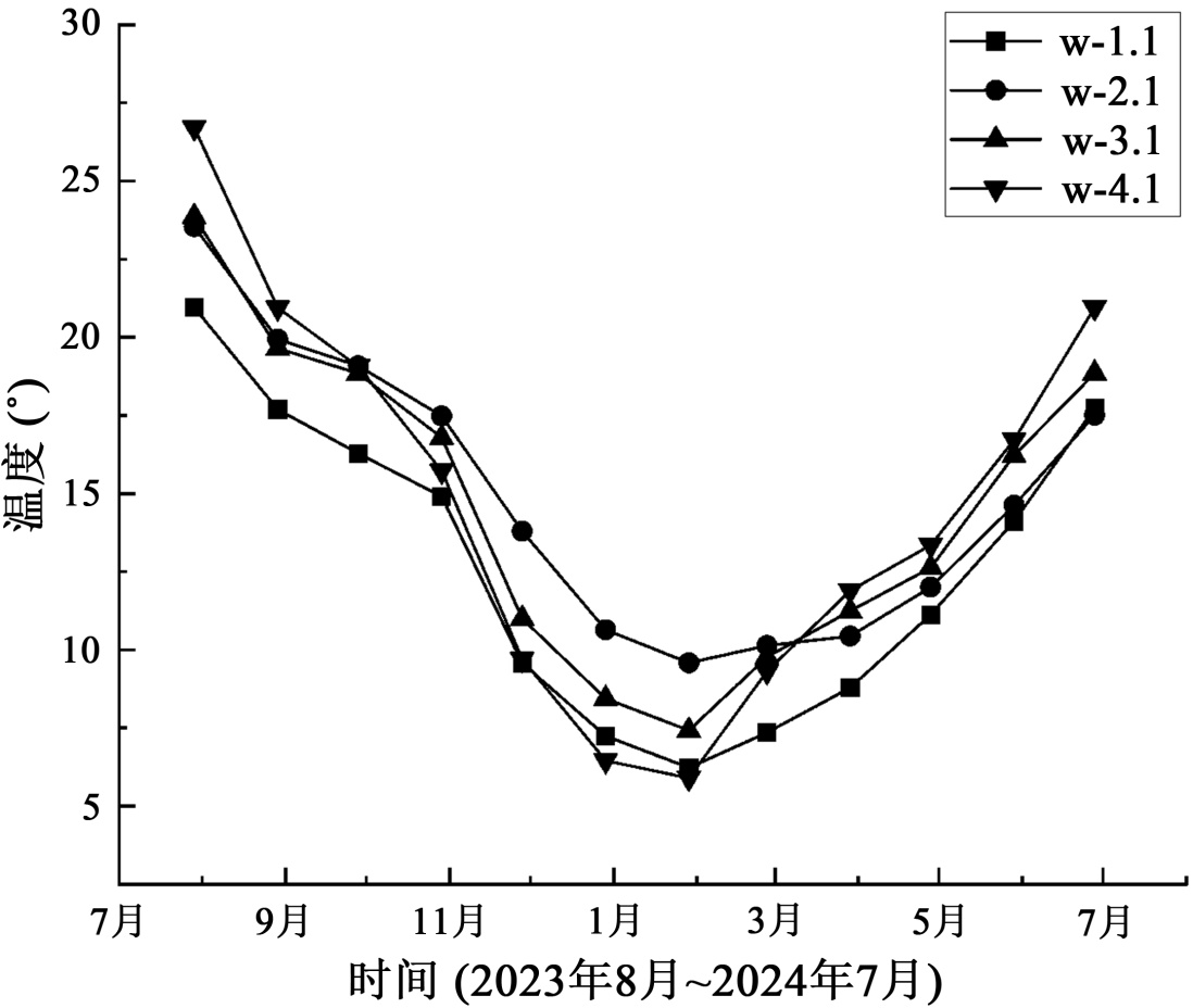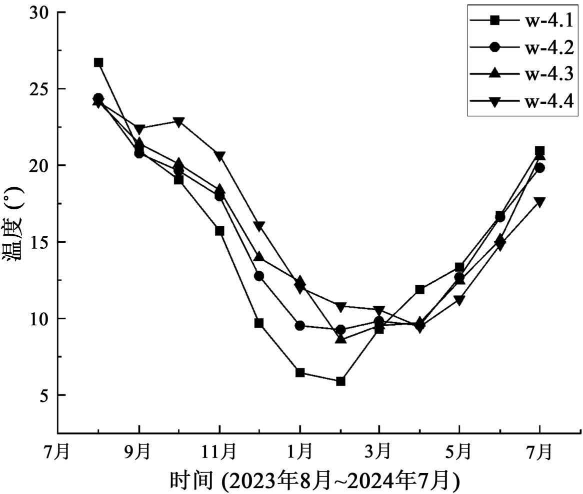 基于2023年8月至2024年7月新疆加筋土陡坡的实测月均温度数据,采用布设于同一水平高程的W-4系列温度传感器阵列,分析边坡岩土体在水平方向上的温度场时空分异特征,如图2所示。边坡水平方向存在显著的温度梯度空间分异,且具有强烈的季节依赖性。在冬季低温期(1月前后),坡表附近传感器(W-4.1)温度降至约5.9℃,而水平距离最远的内部传感器(W-4.4)仍维持在约12.0℃,形成约7℃的水平温差。这种梯度源于冷空气对坡表区域的直接热交换作用与坡体内部热惰性的耦合效应:坡表岩土体作为热交换边界层,快速响应大气温度骤降;而水平向内部区域因岩土介质的热阻效应及热量传递的时间延迟,温度衰减显著滞后。值得注意的是,在春季升温期(4月),水平温差呈现动态演变——当W-4.1已回升至11.9℃时,W-4.4仍保持约9.5℃,形成“外热内冷”的瞬态结构,此现象可能导致岩土体产生水平向非均匀热应力。沿水平热传导路径,温度响应呈现显著的相位滞后与衰减效应。在秋季降温阶段(9~11月),W-4.4降温速率较坡表W-4.1延迟约30天,具体表现为11月W-4.1已降至15.7℃时,W-4.4仍保持在20.1℃左右。这种空间滞后是水平热传导速率与岩土体体积热容共同作用的结果,其物理本质为热扰动在介质中传播的阻尼效应。相位差的持续存在,使得边坡内部在季节转换期始终处于热力学非平衡状态。高温期(7月)各传感器温度收敛于16℃~22℃区间,水平方向最大温差缩小至6℃,表明在持续太阳辐射驱动下,水平热传导使边坡内部趋于热均衡。坡表作为大气–岩土体热交换界面,对气温日变化、瞬时辐射波动及局地风场扰动高度敏感;而内部区域因岩土介质的热惯性作用,形成天然的温度缓冲层。这种边界扰动效应可能导致坡表浅层岩土体经历更频繁的热疲劳循环。