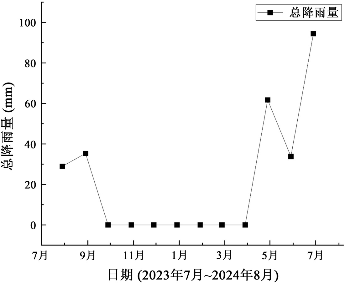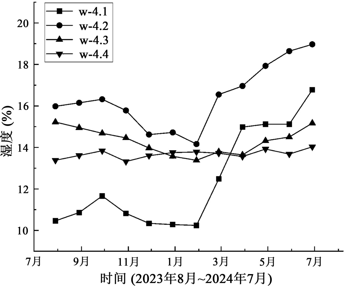 距坡面不同水平距离湿度和月份降雨量如图4、图5所示。W-4.1至W-4.4四组传感器在2023年7月至2024年7月的连续监测数据显示,土壤湿度的显著季节变化规律。土壤湿度呈现规律性振荡,最大变化范围介于10.2%~16.8%之间(W-4.1),年变幅达6.6%。在新疆极端干旱气候背景下,大气蒸发作用对加筋土陡坡湿度场的控制性影响远超降水补给效应。尽管监测初期(2023年7~9月)存在季节性降水事件,土壤湿度仍呈现持续性衰减趋势,且未见降水后的有效恢复。这一现象表明,有限的降水入渗量被极高的蒸发通量快速抵消,导致水分在土体中的滞留时间显著缩短。尤其值得注意的是,长达10个月的无雨期内持续的蒸发耗散,驱动了土壤水分库的渐进性枯竭,形成由深层向表层的单向水分迁移路径,凸显干旱区水分运移的不可逆特征。坡面区域(w-4.1)作为土–气界面的关键过渡带,其湿度动态表现出独特的敏感性。该区域虽对降水存在短暂响应,但在蒸发主导期呈现全断面最剧烈的干燥化进程。这源于其直接暴露于太阳辐射与大气对流形成的复合蒸发驱动力,导致表层土体成为水分损失的优先通道。相较之下,内部区域(w-4.2~w-4.4)的湿度变化呈现显著衰减与滞后特性,反映土体对蒸发胁迫的缓冲能力。