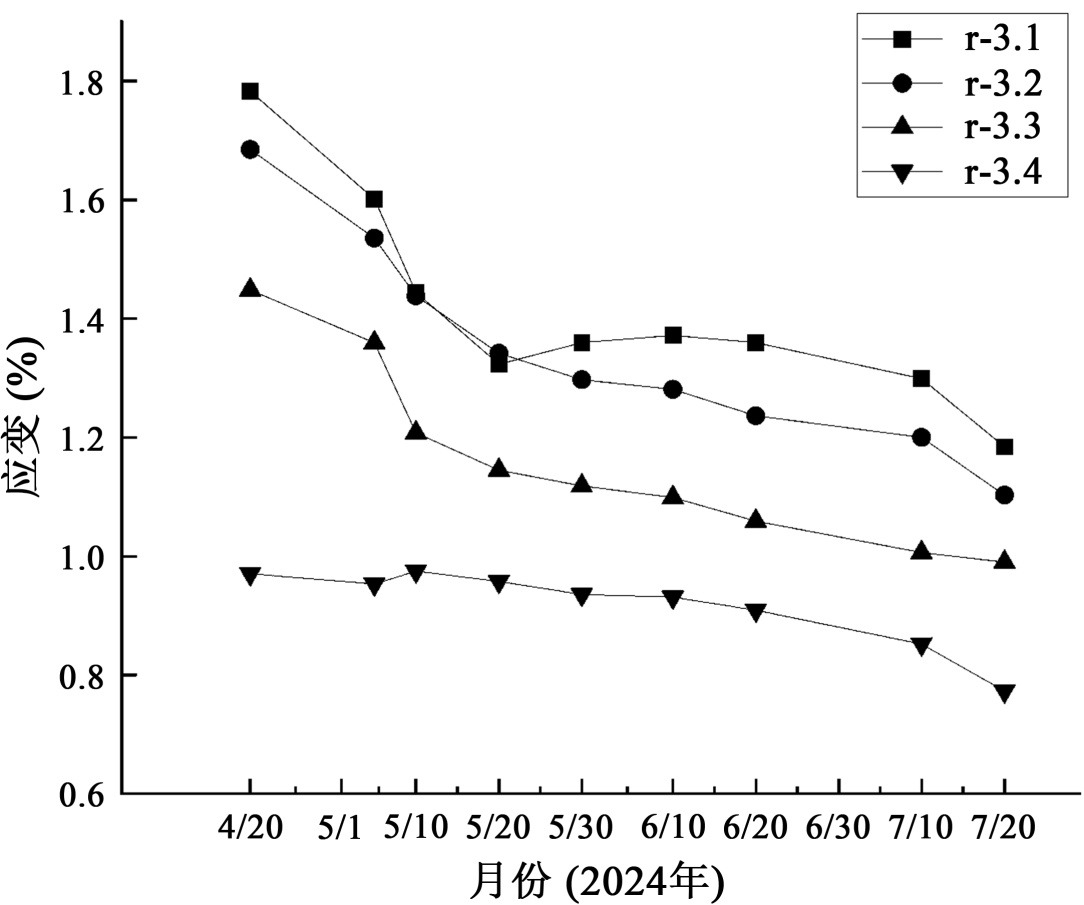 图7呈现了加筋土陡坡同一高程不同水平位置(测点编号r-1.3.1至r-1.3.4)土工格栅应变的监测结果。数据分析表明,格栅应变在时间维度上具有显著的阶段性演化特征:随历时增长,土工格栅应变总体呈现持续减小的趋势,且该趋势在靠近坡面的位置表现更为显著。这一现象主要归因于季节性冻融循环作用。在冬季冻结期,土体发生冻胀,其膨胀变形受到土工格栅的约束,导致格栅内部应变增大。进入夏季融化期后,随着温度回升,冻胀土体融化并产生体积收缩,格栅随之出现回缩现象,宏观上表现为应变的减小。空间分布上,距坡面水平距离越大,土工格栅所承受的应变水平越低。这种应变的空间梯度分布规律与土工格栅的摩擦加筋机制密切相关。靠近坡面的区域,为有效限制坡面土体在冻胀及融化过程中的显著位移,土工格栅需要发挥更强的约束作用,导致其产生较大应变;而远离坡面的内部土体,其位移受周围土体约束作用较强,位移量相对较小,因此土工格栅发挥的加筋约束效应及其所诱发的应变响应也相应减弱。