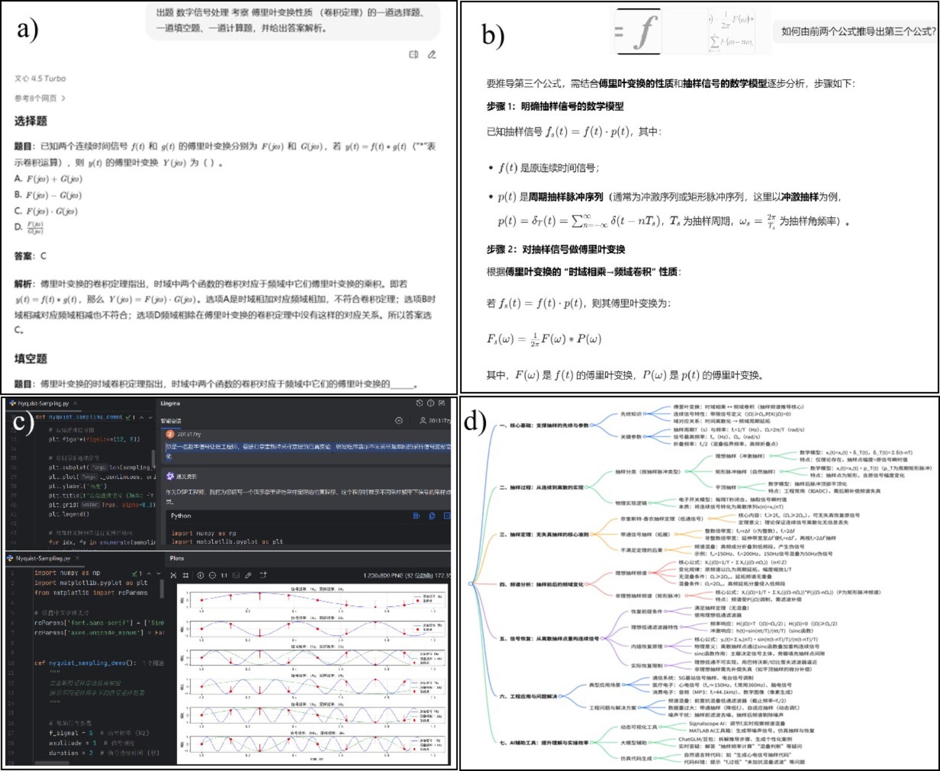 对重要的先修课程内容进行摸底,能快速唤醒学生对相关知识点的记忆,为理解抽样信号频谱推导等难点奠定基础。借助AI大模型,生成聚焦傅里叶变换、卷积定理、周期矩形脉冲信号的傅里叶变换等先修知识的定制化测评题,利用文心一言生成的试题如图2(a)所示,同学们在做题过程中就可明确自身知识漏洞,自主定制精准复习策略;老师通过学情数据深度分析,可精准定位学生知识薄弱点,如频域卷积定理理解不透彻、频谱分析逻辑模糊,这有利于老师确保教学起点与学生基础精准匹配,把有限课堂时间投入共性难点,为后续抽样定理推导奠定统一、坚实起点。