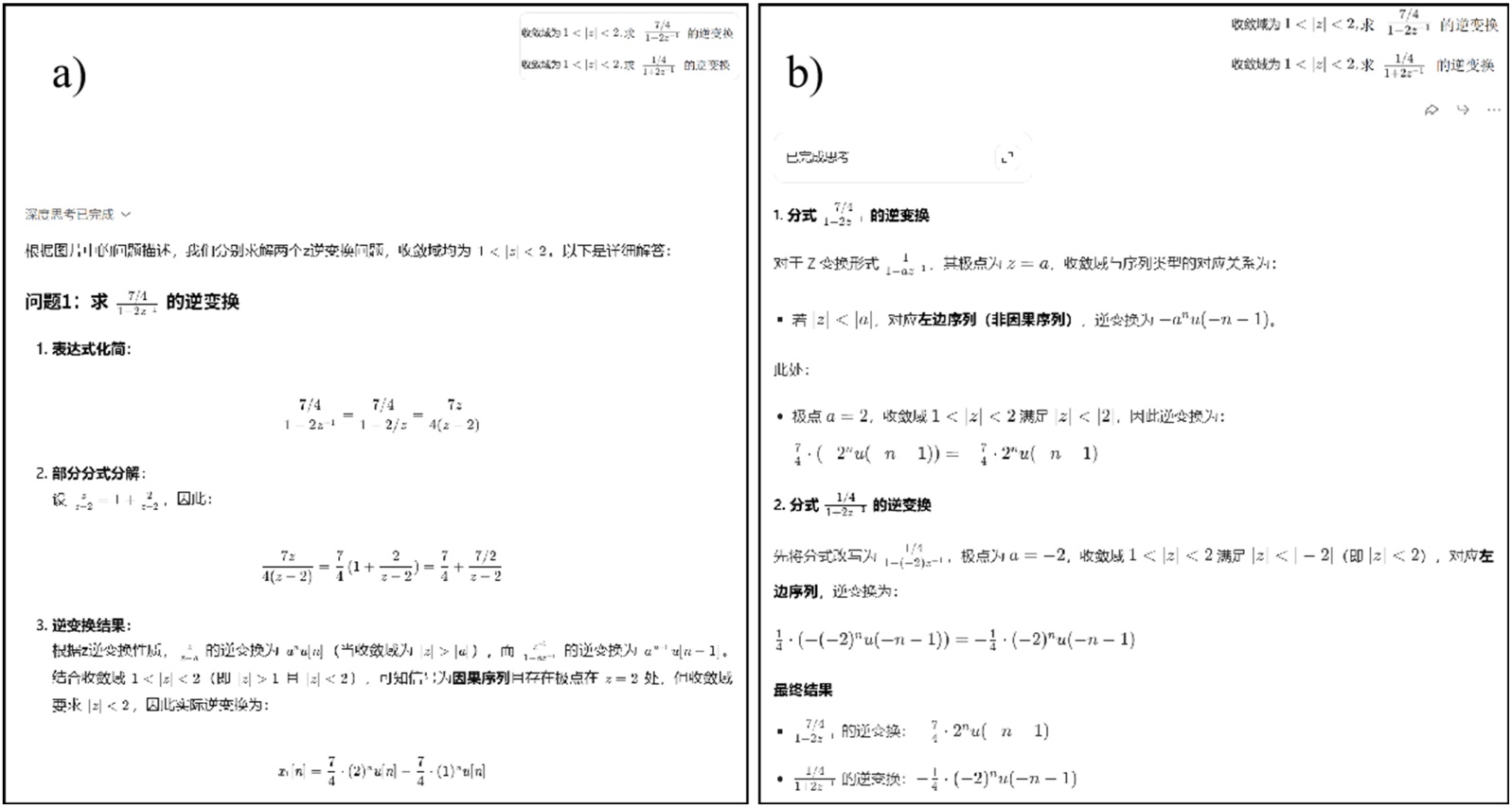 在AI辅助DSP教学实践中,大模型的“幻觉”问题逐渐凸显。例如,求解在逆Z变换这类题目时,某一主流大模型给出的错误解答如图4(a)所示,这些错误答案往往逻辑包装严密,初学者既难察觉疏漏,长期依赖还易弱化独立思考的意识。多模型交互可能缓解这类问题,即,通过对比分析不同大模型的解题过程(图4(b)所示大模型的推导结果正确),结合已有个人储备知识,手动验证AI结论的关键环节,追溯错误根源(比如此次逆Z变换中,模型对收敛域与序列类型的对应关系出现了混淆),最终得出正确的解答,强化对知识点的掌握。这一过程有助于学生提升主动质疑、验证信息的能力,有利于逐步养成批判性思考的习惯。AI不再是被动的答案提供者,也是能助力学生锻炼独立辨别信息真伪能力的互动教具。