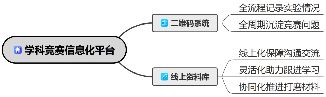 在竞赛实体平台的基础上,为破解跨专业、跨校区备赛的时空壁垒,提升赛事信息沟通效率与开放实验室利用效能,我们采用了两类核心信息化手段构建高效备赛支撑体系:第一类是二维码动态管理模块:选用免费工具(草料二维码、微微二维码、彩虹二维码、QR Code Generator等),开发“打卡–反馈–建档”三合一功能,通过学生端实时提交数据、教师端即时响应,形成“常见问题及对策库”,实现实验室资源的动态调度与问题闭环处理。为激活多年积累的离散文本问题库价值,可进一步将其转化为知识图谱,实现高级应用开发。具体分两步推进:一是要素抽取,采用“人工 + 机器”模式,依托人工智能提取核心信息,通过词频统计关键问题。二是关联构建,搭建“竞赛–问题–反思”核心架构,按周、月、学期对二维码模块信息周期化更新。此举可有效延伸二维码模块效能,实现问题智能匹配、资源优化调度、跨校区知识共享。第二类是多端同步资料协同模块:选用线上资料库(如有道云笔记、语雀和石墨文档等),它们通常支持PC、Android、Web等多终端同步,同时兼容图片、PDF、Office系列文档等多种教学常用附件格式,能为师生随时调阅资料、开展竞赛项目文档管理提供便捷支撑。全组成员都可通过多端查看、自主灵活处理项目任务,这不仅搭建起有效的沟通桥梁,还能随时浏览项目过程中的多格式文档,构建“项目全流程资料池”,覆盖从方案设计到成果总结的全环节,解决跨年级、跨校区备赛的资料传递与协同问题。