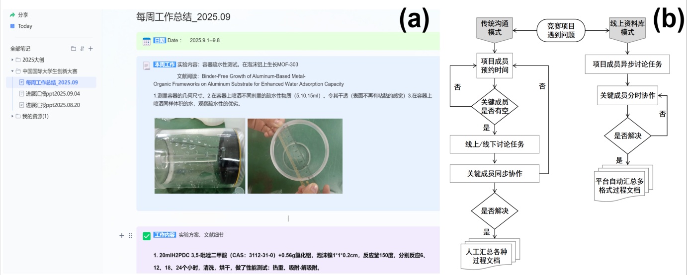 图3. (a) 团队成员利用某线上资料库进行项目讨论,(b) 用线上资料库前后的项目推进流程对比