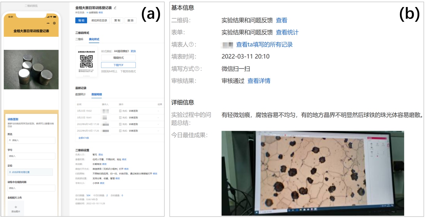 图4. (a) 金相技能大赛训练签到和某二维码软件后台页面,(b) 学生反馈信息