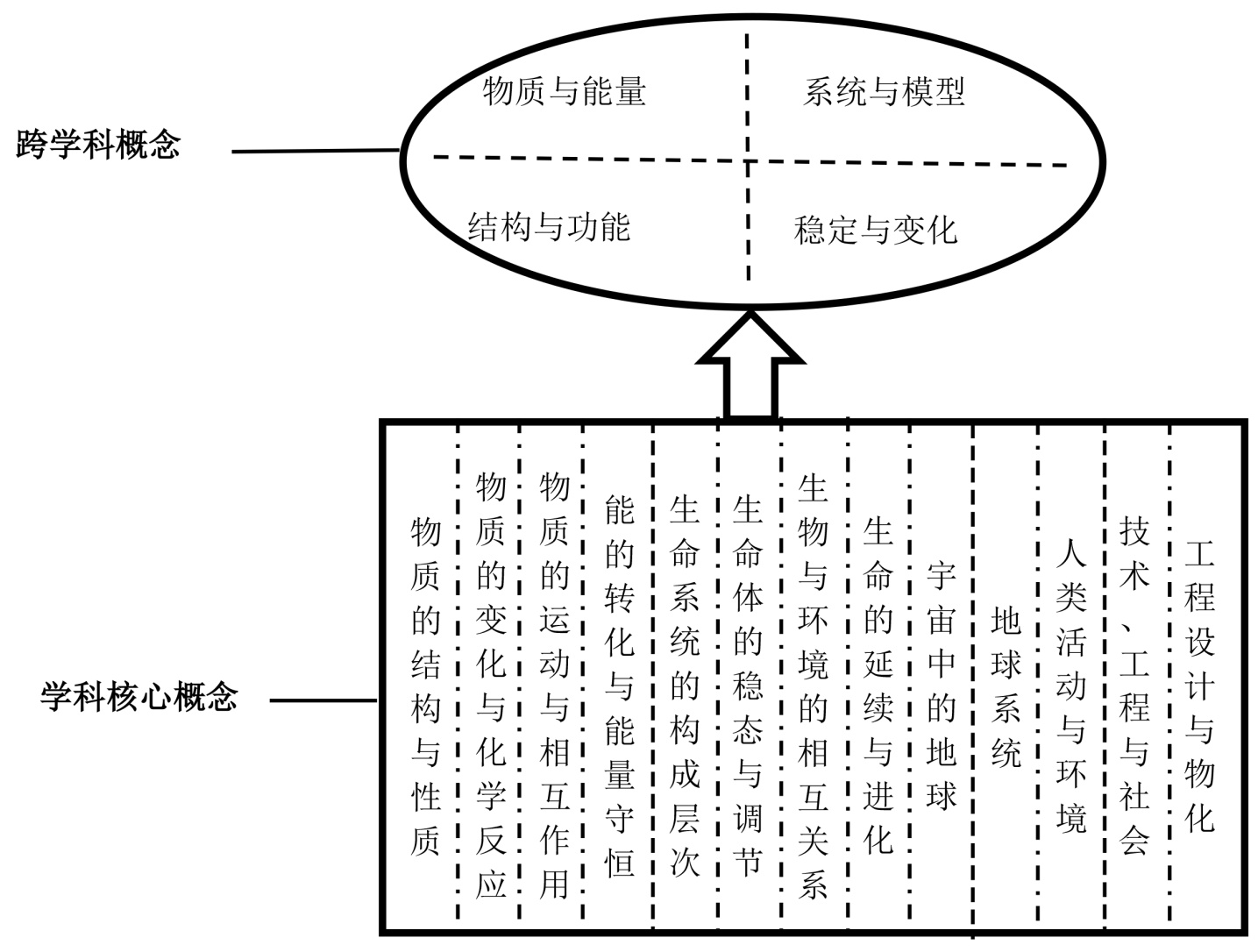 2022年3月25日,教育部印发了义务教育课程方案和语文等16个课程标准(2022版) [2],其中就包括了《义务教育科学课程标准(2022版)》(以下简称新课标)。新课标包含了义务教育科学课程的课程性质、课程理念、课程目标、课程内容、学业质量和课程实施六个部分。科学课程设置了13个学科核心概念,是所有学生在义务教育阶段应该掌握的科学课程的核心内容。通过对学科核心概念的学习,理解物质与能量、结构与功能、系统与模型、稳定与变化4个跨学科概念(如图1所示) [3]。