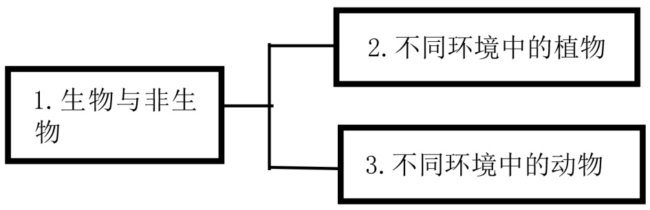 在单元主题之下,几个次级主题之间存在上下级关系的称为总分式结构。总分式的表现有“总–分”的形式,例如人教鄂教版小学《科学》四年级下册第三单元“环境中的生物”(如图2),第1课是生物与非生物,第2课是不同环境中的植物,第3课是不同环境中的动物。第1课意在让学生知道环境包括生物与非生物,生物与非生物之间存在相互影响的关系。后面2课并列平行,目的在于使学生了解植物离不开环境,动物也离不开环境,动物也离不开周围的植物,动植物也是相互依赖的。