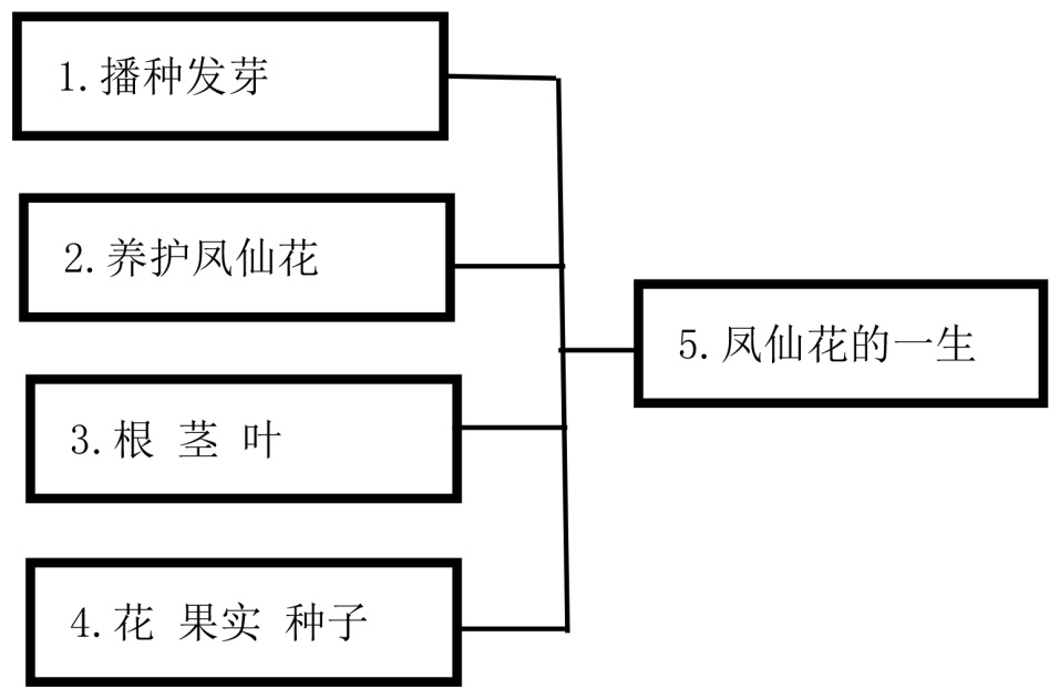 总分式的表现还有“分–总”的形式。例如人教鄂教版小学《科学》三年级下册第二单元“种凤仙花”(如图3),第1课是“播种发芽”,第2课是“养护凤仙花”,第3课是“根 茎 叶”,第4课是“花 果实 种子”,第5课是“凤仙花的一生”。前4课通过种植和观察凤仙花的生长过程,了解凤仙花的生长周期,包括种子发芽、生长、开花、结果和死亡等阶段,第5课是总结凤仙花从种子发芽到枯萎死亡,经历了哪几个不同的阶段?凤仙花的一生是怎样的?