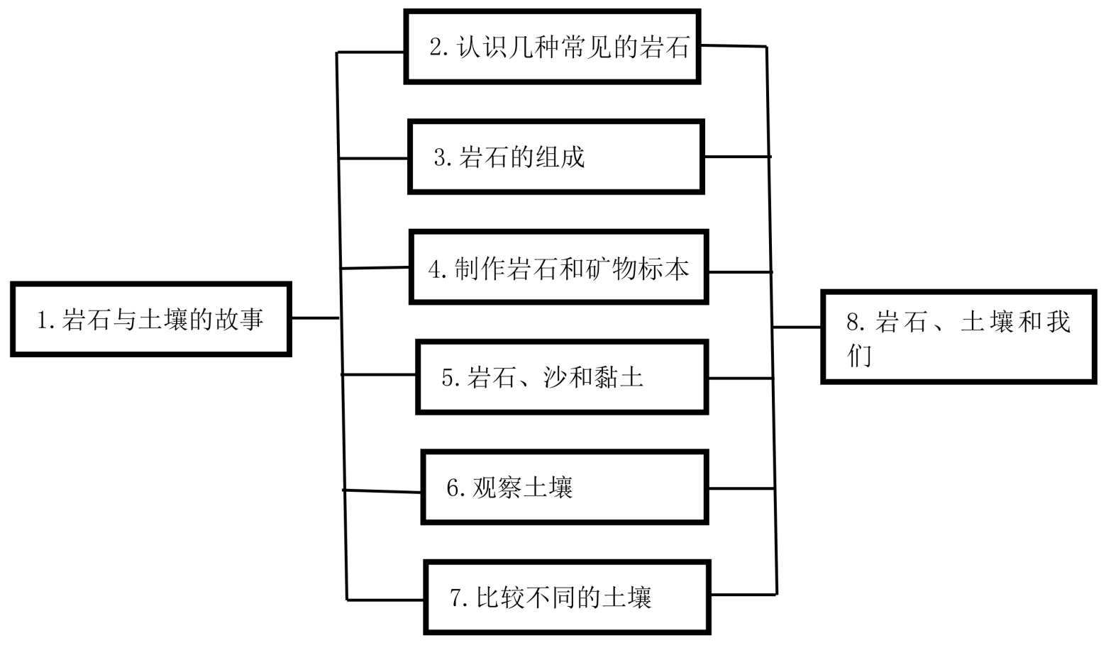 总分式还可以表现为“总–分–总”的形式。例如教科版小学《科学》四年级下册第三单元“岩石与土壤”(如图4),第1课是“岩石与土壤的故事”,第2课是“认识几种常见的岩石”,第3课是“岩石的组成”,第4课是“制作岩石和矿物标本”,第5课是“岩石、沙和黏土”,第6课是“观察土壤”,第7课是“比较不同的土壤”,第8课是“岩石、土壤和我们”。第1课从故事的视角,整理我们知道的岩石和土壤知识。第2至第4课围绕认识岩石展开,第5课是过渡课,将岩石和土壤建立关联,指导学生初步认识到土壤是岩石风化而成的,第6、7课围绕认识土壤展开。总之,第2~7课是引导学生探究岩石和土壤的组成、类别及特征等知识,构建起相关科学概念,培养相应科学探究能力。第8课通过对岩石、矿物和土壤之间关系的整理,了解它们与我们生活的密切联系,认识保护岩石和土壤等自然资源的重要性,整体提升学生的认知水平。