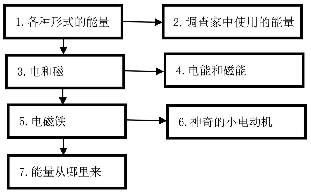 在单元总主题之下,几个次级主题彼此相互关联,存在一定的前后相继关系的称为延伸式结构。例如教科版小学《科学》六年级上册第四单元“能量”(如图6),第1课是“各种形式的能量”,第2课是“调查家中使用的能量”,第3课是“电和磁”,第4课是“电能和磁能”,第5课是“电磁铁”,第6课是“神奇的小电机”,第7课是“能量从哪里来”。本单元以“能量的转化与流动”为核心,围绕“认识能量形式→探究电能转化→理解电能来源→追溯能量本源”的逻辑展开,旨在帮助学生从生活现象切入,逐步建立“能量是物质运动的表现形式,可相互转化且守恒”的科学观念,为后续深入学习打下基础。第2课根据第1课的知识来指导学生确定调查内容,第3课内容不仅与第1课的内容有关联,同时作为前后课的桥梁,也与第4课、第5课、第6课、第7课有关联。