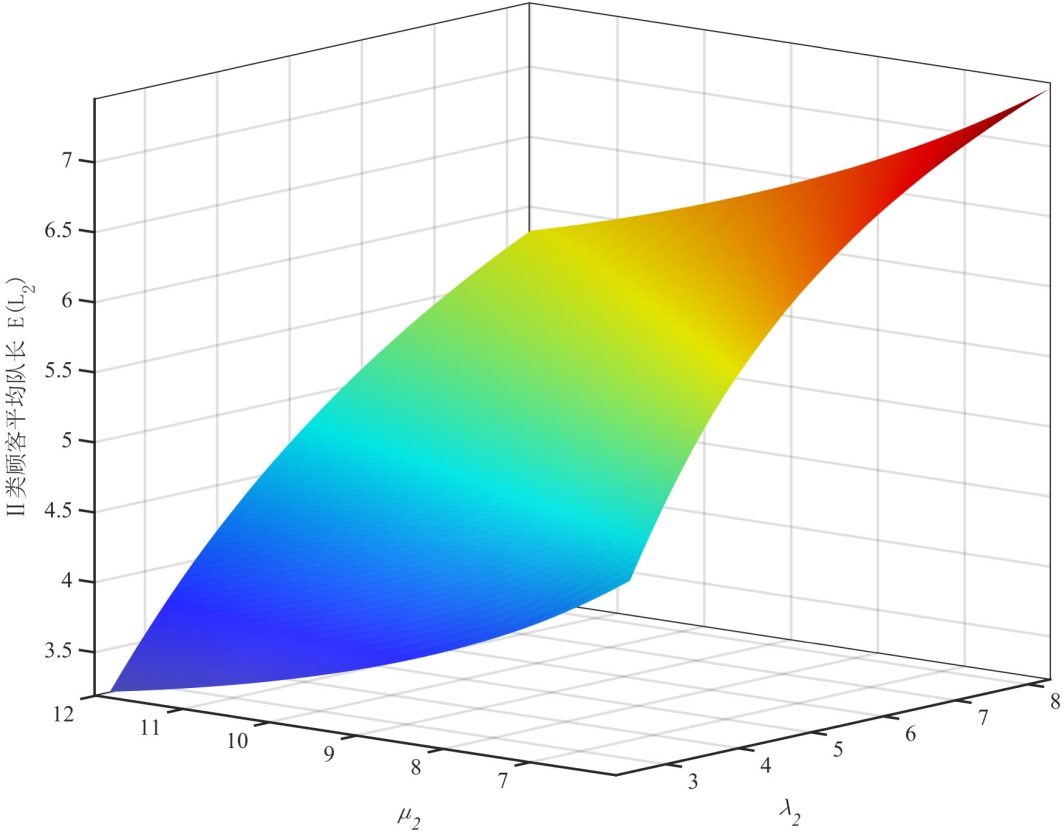 的增大而增大。由于系统提高对Ⅱ类顾客的服务率,使单位时间内有更多的Ⅱ类顾客完成服务,显著减少其等待时间,且服务率增大使得Ⅱ类顾客在系统中获得的收益增加。所以对于Ⅱ类顾客来讲,提高服务率