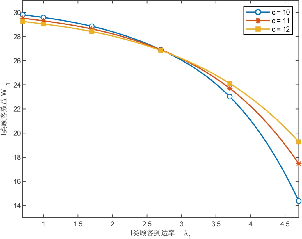 的增大而减少。由于Ⅰ类顾客到达率的增加会使得系统内Ⅰ类顾客的数量增加,导致服务资源拥堵,增加Ⅰ类顾客的等待时间,增加时间成本导致个人效益降低;当固定Ⅰ类顾客到达率