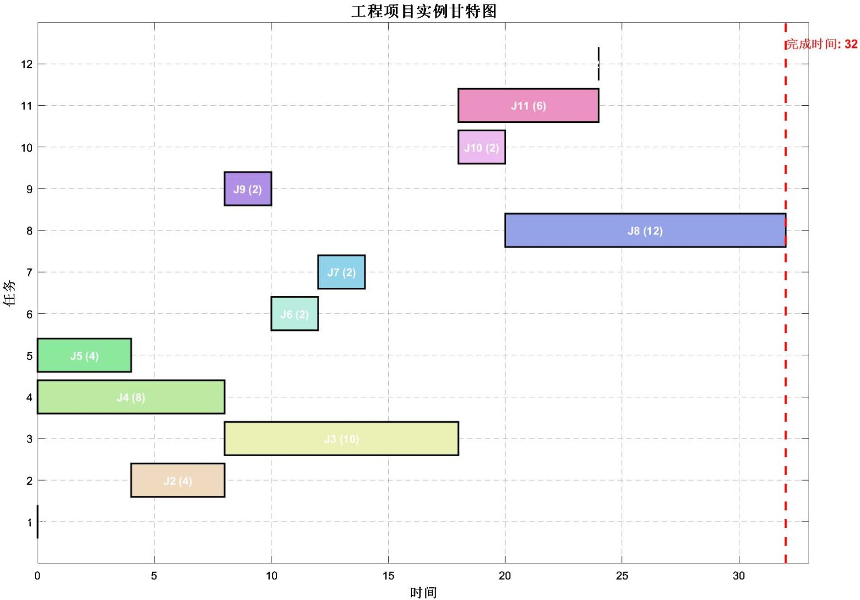 (2) 在实际案例应用中,该算法成功求得已知最优解,并输出了可行的项目调度方案与直观的甘特图,验证了其在现实场景中的适用性与有效性。