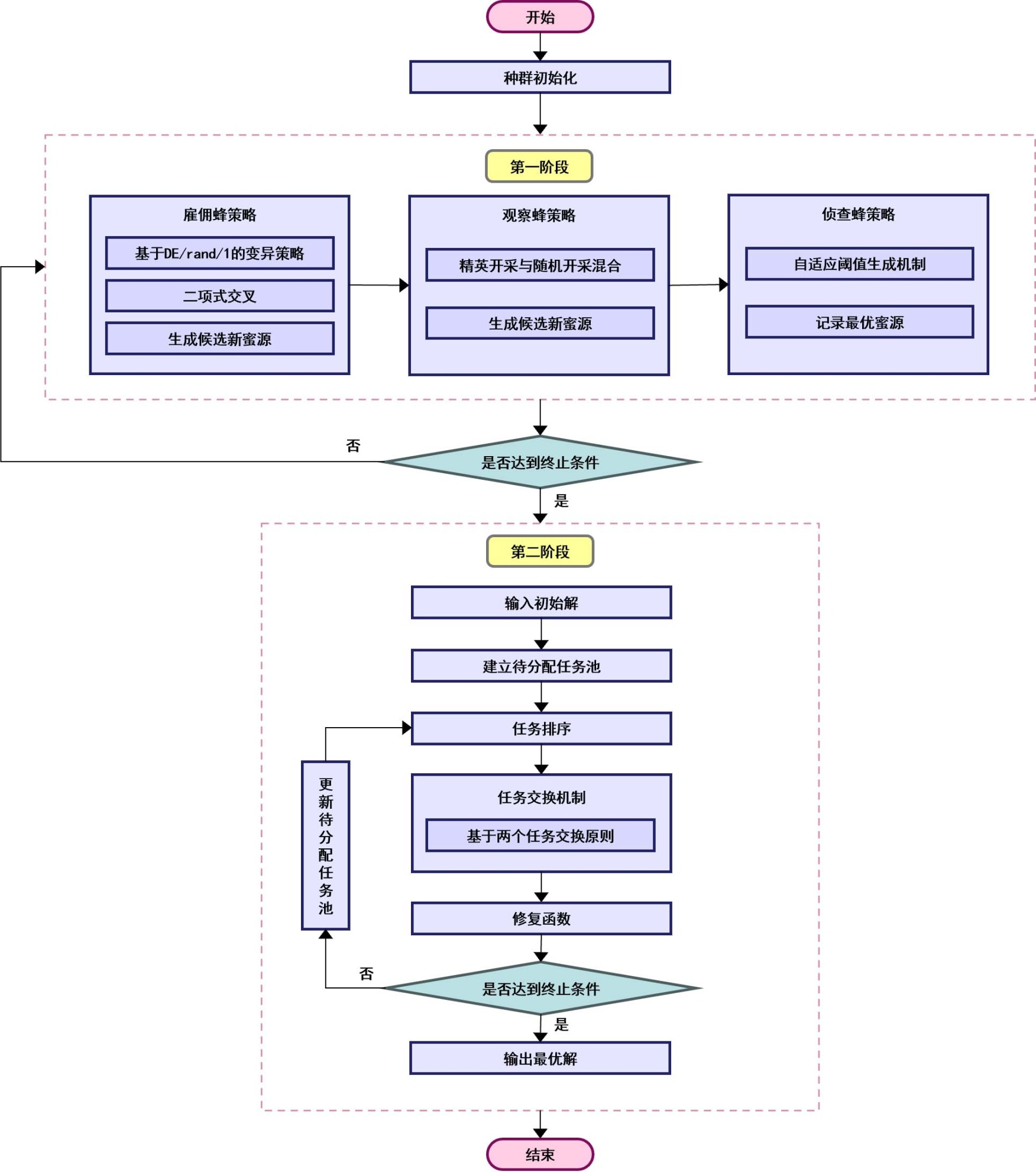 图1. 混合贪心策略人工蜂群的两阶段算法流程图