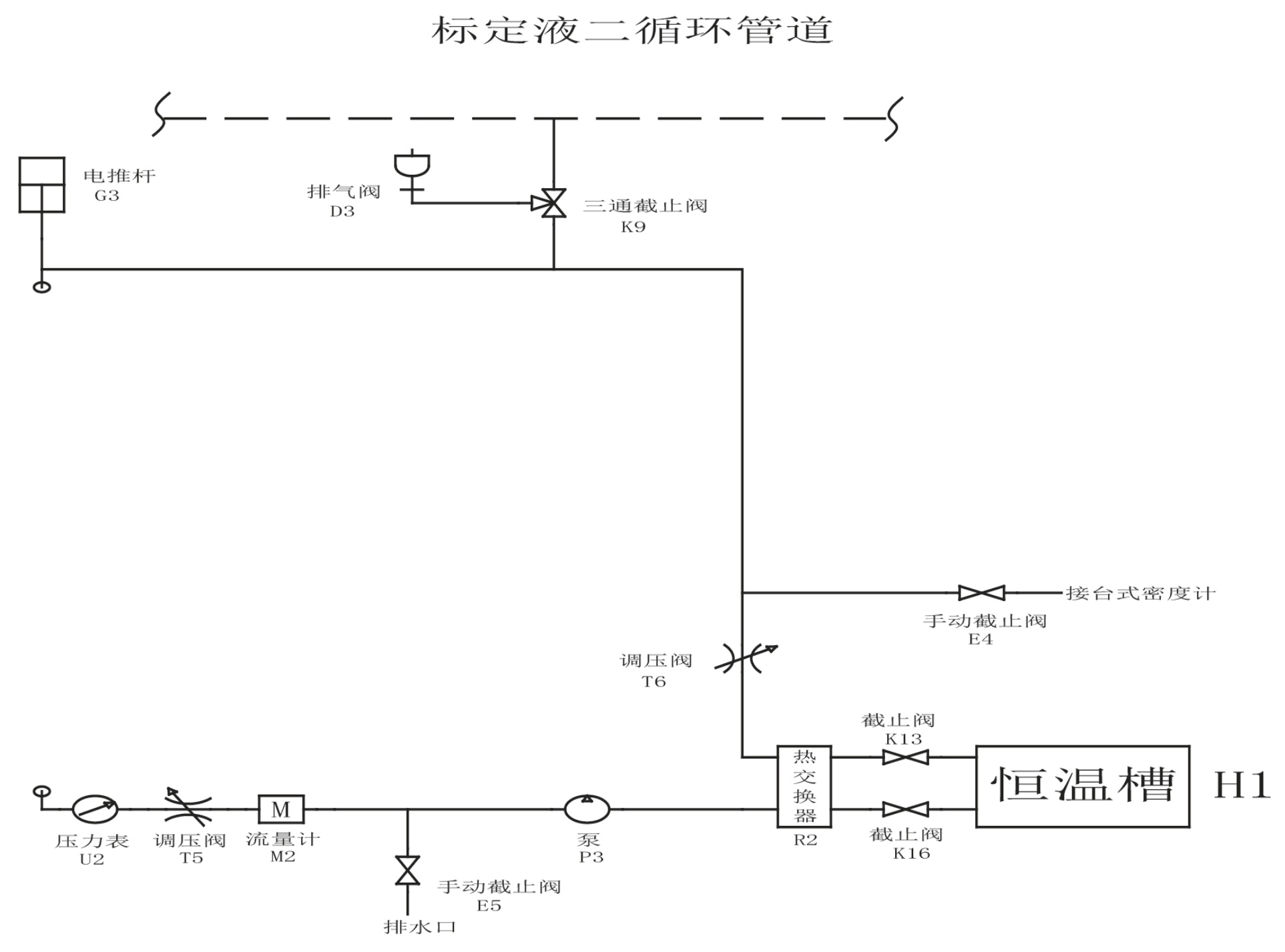 装置采用“一测多标”的并行校准模式,每套校准介质循环管道独立配置恒温槽、热交换器和加压系统。以校准介质二循环管道为例,如图2所示,介质流程为:第一循环接口→第一调压阀(如T6)→热交换器(R2)第一换热端→第一截止阀(K13)→恒温槽(H1)→第二截止阀(K16)→热交换器(R2)第二换热端→泵(P3)→流量计(M2)→第二调压阀(如T5)→压力表(U2)→第二循环接口。其中恒温槽用于精确控温,加压泵可实现压力调节,满足不同工况模拟需求。