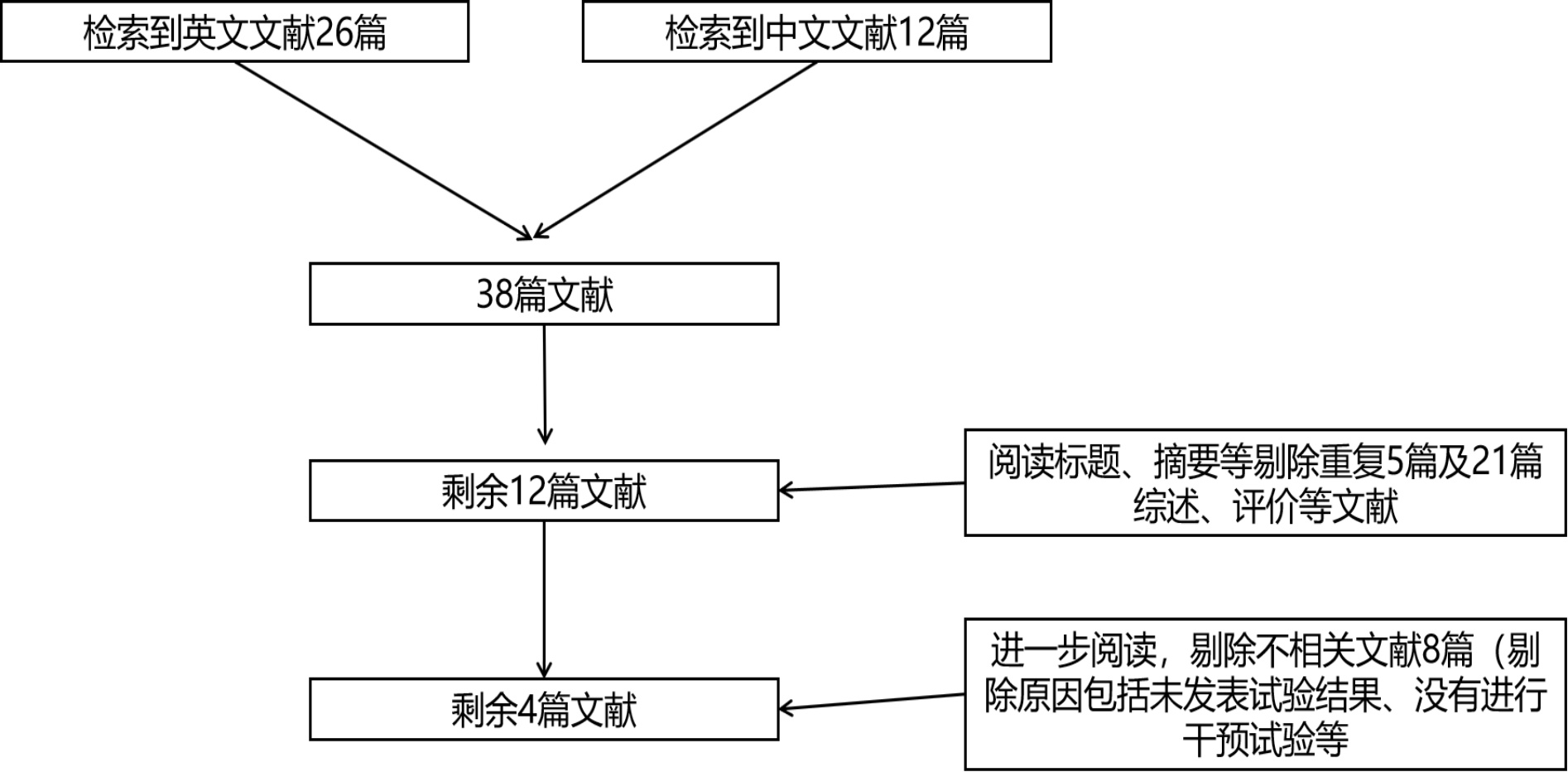 ① 排除文献类型:经验总结、个案报道、综述、护理、食疗及药膳类、病例报告和分析;② 非随机对照试验;③ 治疗数据不完整、无法获取全文、无法提供原始数据资料、重复发表的国内外文献(仅语言不同)等不能为本研究使用文献;④ 文献中样本含量小于20例;⑤ 排除对药物过敏、妊娠和哺乳期妇女,以及有其他严重器质疾病的患者。