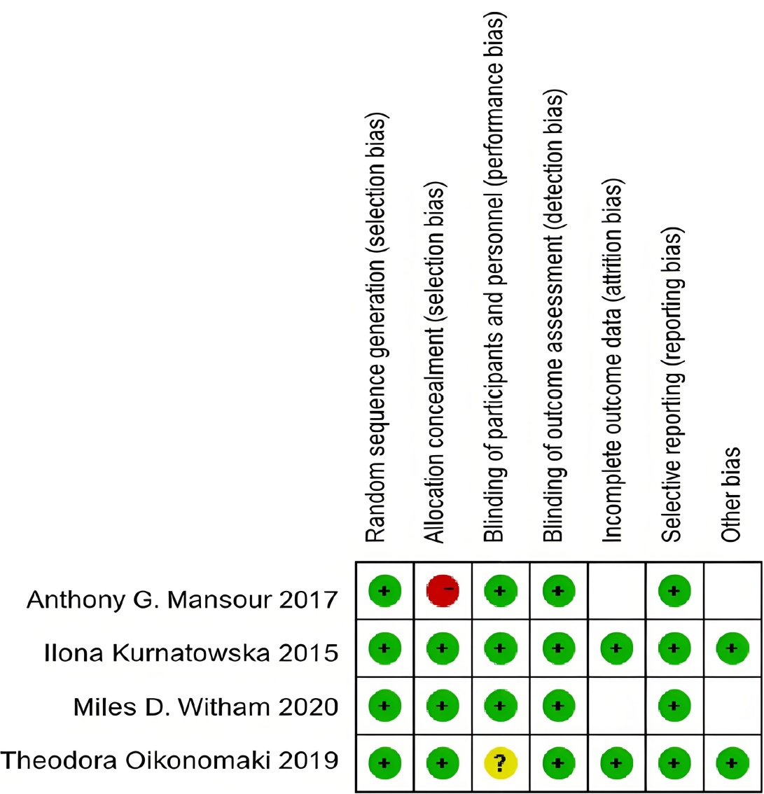 纳入的4篇文献中,3篇采用了随机对照的方法,1篇为单臂实验。有2篇采用了双盲法。不存在选择性报告和偏倚情况,但4项试验中有个别病例中途退出或死亡导致结果缺失个别数据。纳入文献的方法学质量评价见图2和表1。