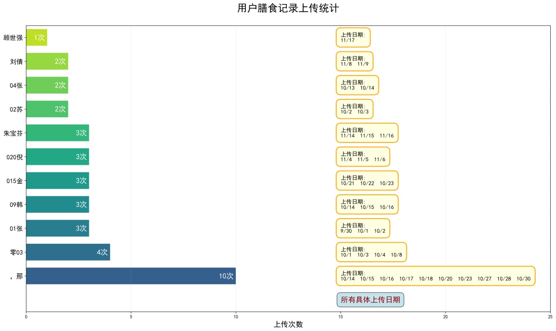 这些用户在两个月内共记录了65个独立餐次。为实现多角度记录,部分餐次包含多张图像,累计有效图像158张。基于深度学习图像识别模型,系统从图像中自动提取出197条具体食物记录,每条记录包含食物种类及其在图像中的位置信息。具体而言,每餐可包含多张食物图片以获取不同拍摄视角(例如单餐上传3张不同角度的照片)。同时,由于部分图像可能包含多种食物(例如两张不同视角图片共含5类食物),系统需通过多图融合分析,以准确识别与统计每餐的完整膳食构成。