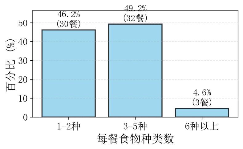 膳食多样性在本研究中被操作化定义为每个独立餐次中识别出的不同食物种类数量,高频食物则基于全部197条记录的出现频次进行排序统计。分析内容涵盖三个层面:首先,从整体层面统计用户平均每餐食物种类数、高频食物列表、总能量与蛋白质摄入量及蛋白质供能比;其次,按用户标记的“早餐”“午餐”“晚餐”分类,对比不同餐次在食物种类和蔬菜占比上的差异;最后,选取三位在记录完整性与膳食模式上具有代表性的个案,对其连续记录天数内的每日食物种类数变化进行趋势描述,以直观呈现用户间的差异性。