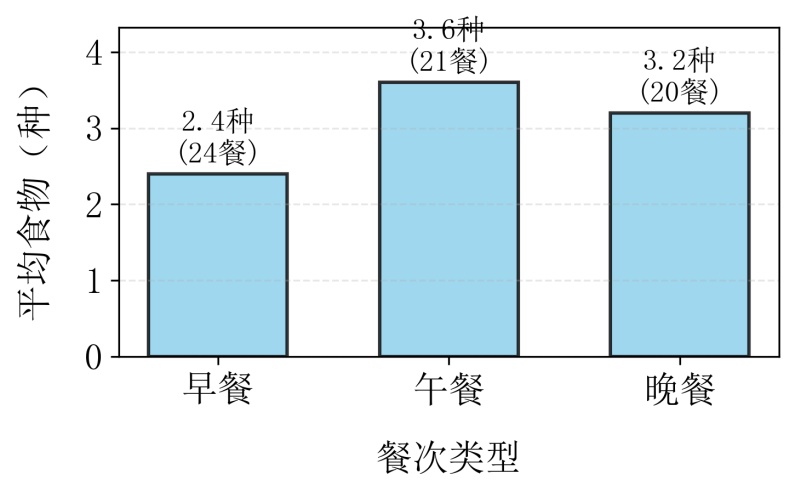 早餐、午餐和晚餐在食物构成上呈现明显差异(见图3(a))。早餐的食物种类最为简单,平均每餐仅包含2.4种食物,其中牛奶、吐司面包和包子为核心食物,体现出明显的便捷性导向。相较之下,午餐和晚餐的膳食结构更为丰富,平均食物种类分别为3.6种和3.2种。午餐中米饭、橘子和红烧鲫鱼的出现频率较高。从食物类别分布来看,晚餐中蔬菜类食物占比达到33.8%,显著高于午餐的20.0%,反映出不同餐次在膳食均衡性上的侧重差异。在能量供给方面,午餐的平均能量密度最高,为696.9千卡/餐,晚餐次之,为539.2千卡/餐,早餐则相对较低。