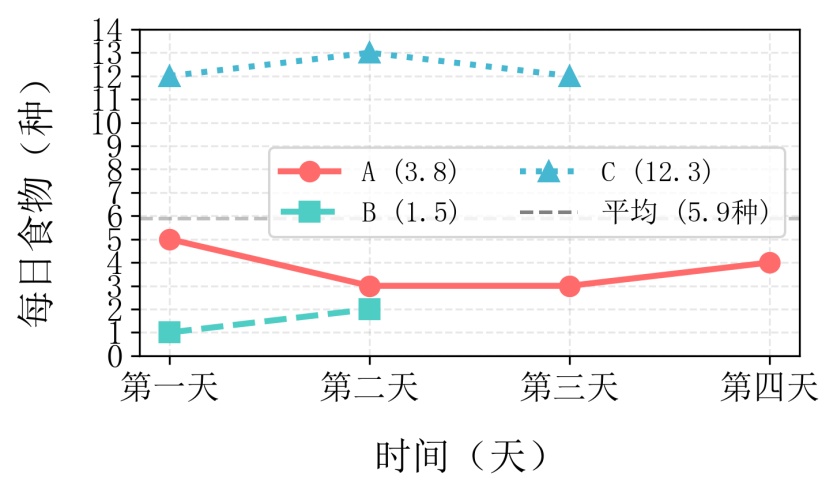 为进一步揭示个体间的膳食差异,本研究选取三位典型用户进行个案分析(见图3(b))。用户A在连续四天的膳食记录中,每日食物种类数介于4至5种之间,呈现小幅波动,整体表现为中等且稳定的膳食多样性水平。用户B仅有两日有效记录,其食物种类从第一天的1种增至第二天的2种,虽呈上升趋势,但整体仍处于较低水平,膳食结构相对单一。用户C则展现出截然不同的模式,连续三天的食物种类数均稳定保持在12种的高位水平,体现出极强的膳食多样性与规律性。这三位用户共同构成了从低多样性、中等多样性到高多样性的完整谱系,生动呈现了肾透析患者群体内部膳食习惯的显著异质性。