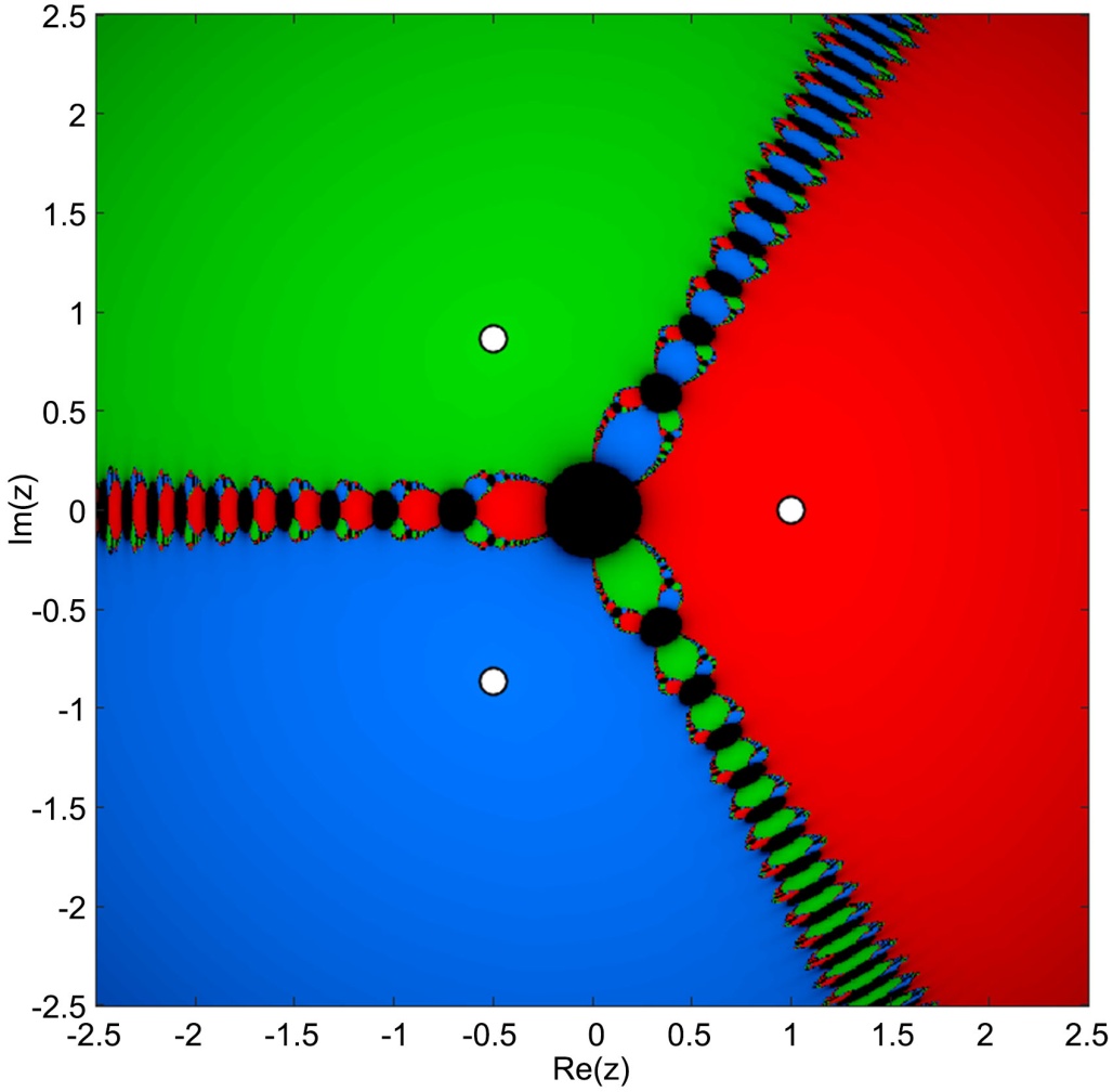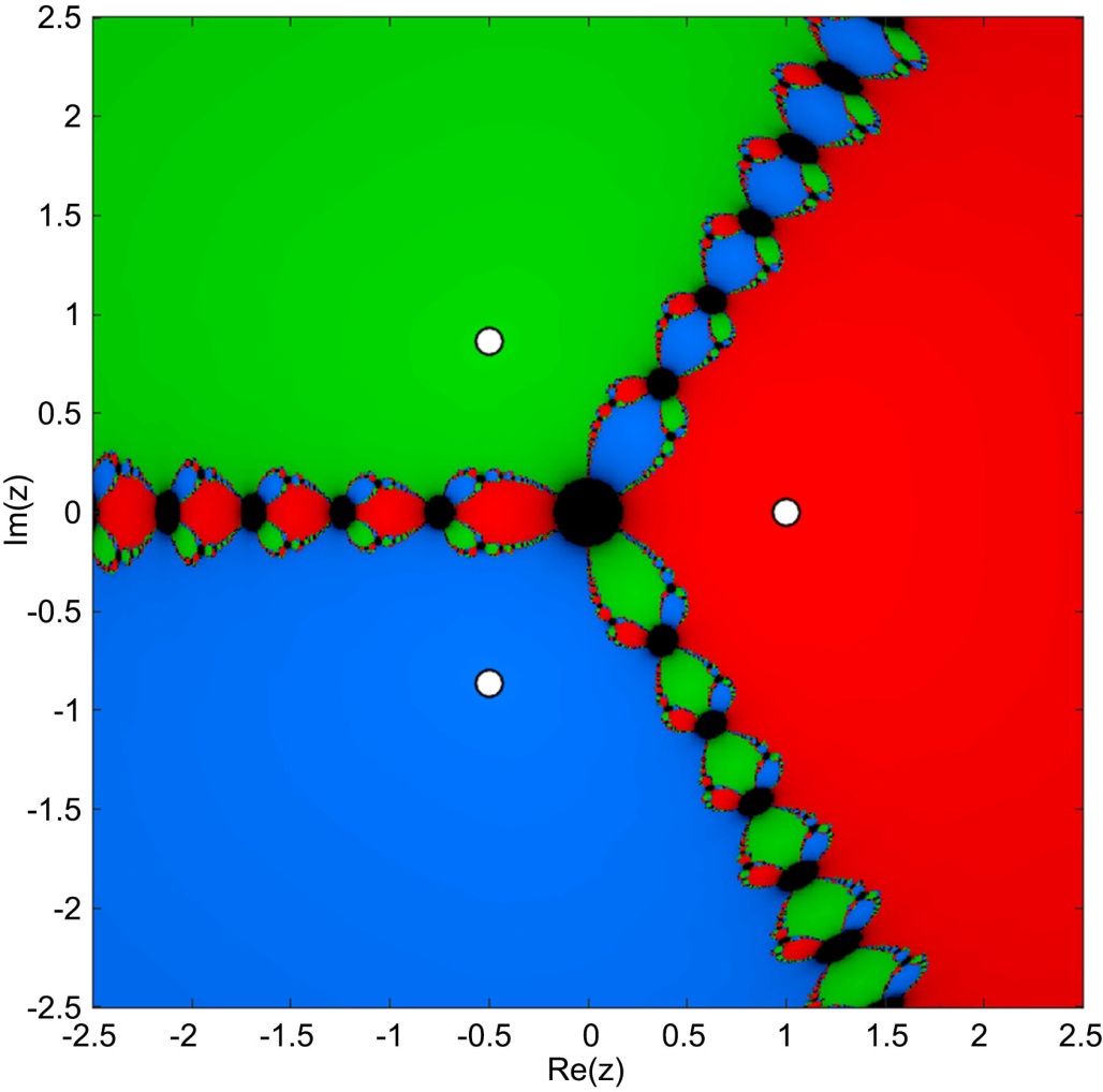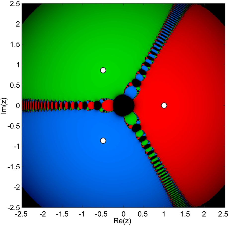 时,分形边界模糊,发散区域减少,颜色更加均匀,分形边界变得模糊,各根吸引盆扩大,收敛率为94.6%;