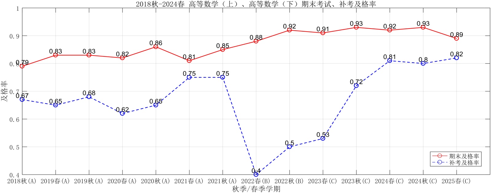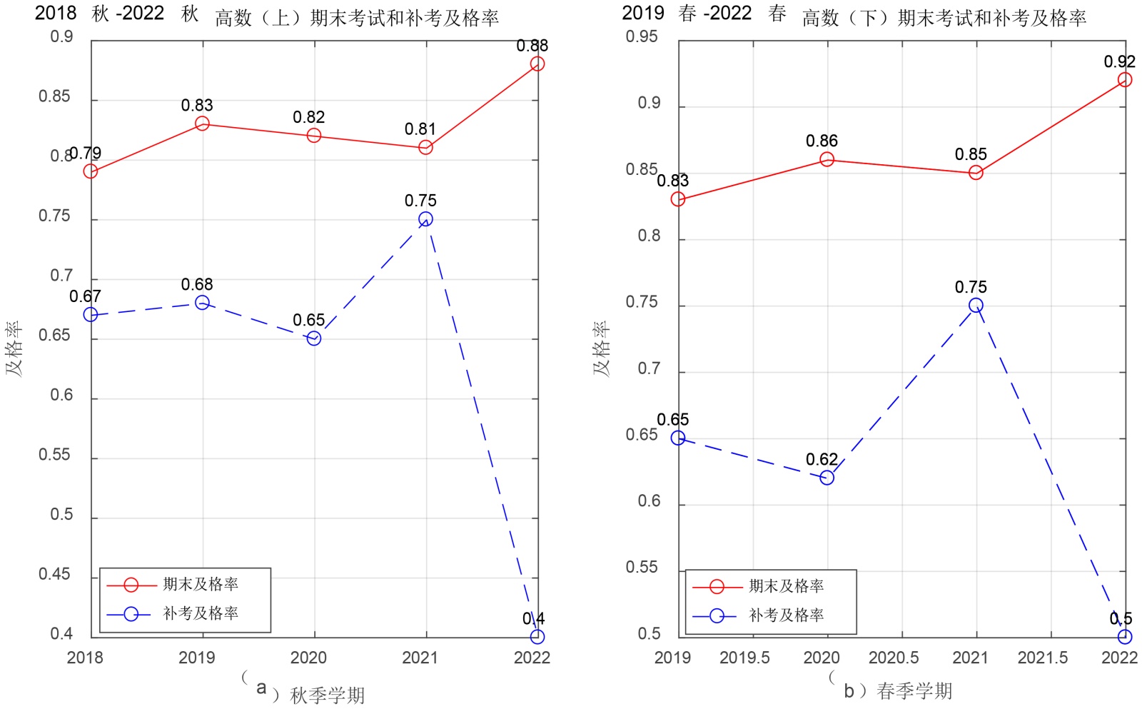 图2. 2018春~2022秋高数(上) (下)期末考试及格率与补考及格率
