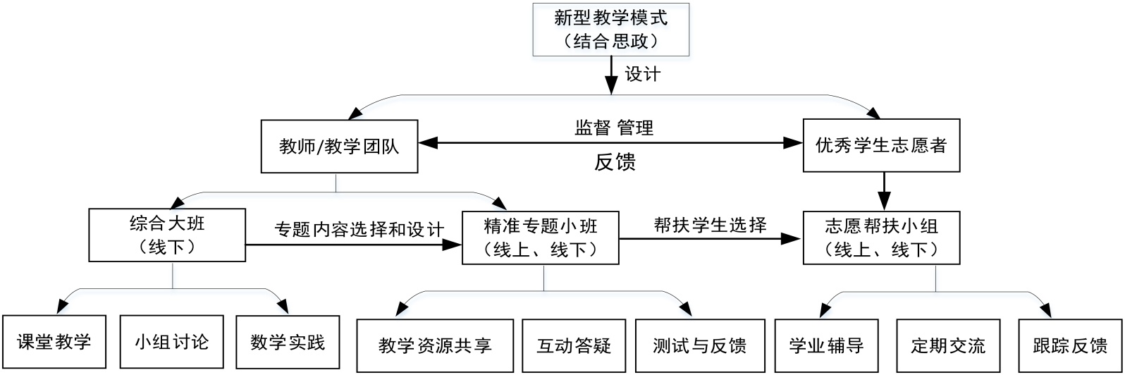 国内众多高校对少数民族学生的大学数学公共基础课(如高等数学、线性代数、概率论与数理统计等)给予了高度的重视[4],为后续相关课程的学习打下坚实的数学基础。上海工程技术大学自2010年开办少数民族预科班以来,已持续办学16载,年均招生规模约60人,累计为民族地区培养近千名基础人才,成为推动教育公平与民族团结的重要实践平台。2020年以前,高等数学的教学模式以板书或多媒体展示的传统教学模式为主,在教学过程中通过引入具体的案例,带领学生在解决实际问题的过程中学习数学知识。2020年春季爆发的疫情,给所有学校,特别是给高校的高等数学教学工作带来空前挑战,在教育部“停课不停教、停课不停学”的号召下,教学理念从以“教师为中心”转移到以“学生为中心”,线上教学平台(超星学习通、云课堂、MOOC (爱课程)平台和SPOC平台等)如雨后春笋般涌现出来,为传统教学模式注入了新的活力[5] [6]。诸多学者深入研究了少数民族预科学生各学科的教学现象的成因和应对策略,积累了丰富的经验。李宜阳提出采用数形结合,增加课堂互动来活跃课堂氛围,让少数民族预科学生“喜爱”上高数,在快乐学习提高成绩[7]。刘晓敏按学生成绩提出了三级分层教学,以实现因材施教[8]。王勇兵提出了强化数学价值认知、激发兴趣、优化教材内容等五类教学方法[9]。赵桂华提出了让学生回归课堂、鼓励自信、记名管理、重复知识等七类教学方法[10]。此外,不少高校积极探索适合少数民族学生的学业帮扶模式,并取得一定成效[4] [11]。然而,在融入思政元素的前提下,以民族团结为导向,辅以志愿帮扶,探讨线上、线下融合的数学学科教学的研究成果较少。