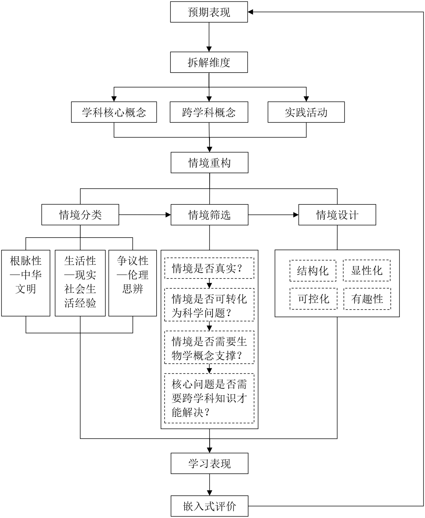 知识的意义植根于真实的社会与实践情境,故第一步应判定情境的真实性,即情境是否与学生实际生活或社会经验紧密相关。其次,依据NGSS提出的科学课程标准,优质教学情境应能转化为可探究的科学问题,便于学生开展证据收集与科学论证的实践活动。第三,结合生物学学科核心素养,判断情境是否需要生物学学科核心概念作为解释和知识支撑,确保学习活动促进学生对基本科学原理的深入理解。最后,参考跨学科知识体系,分析核心问题是否需要多学科协同解决。核心问题必须依靠多学科知识和概念才能解决,这是跨学科学习的核心判断标准之一,从而培养学生的综合思维与创新能力。