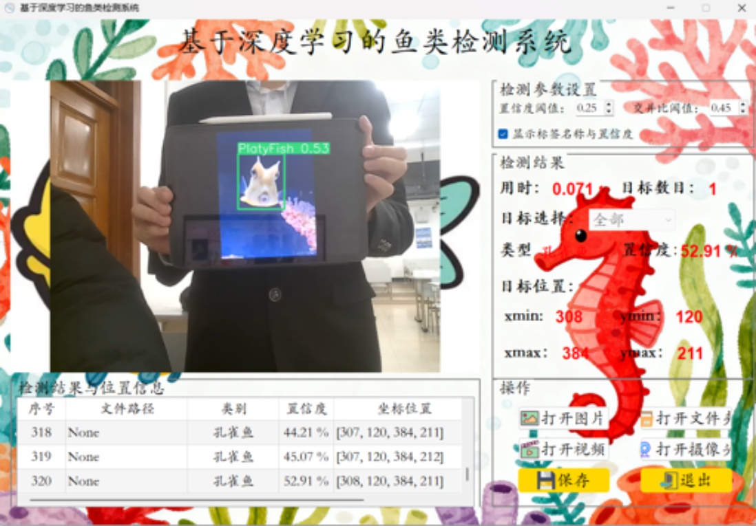 综上所述,本文提出的基于改进YOLOv8n的智能鱼类识别检测系统,通过引入DAttention模块、改进Mosaic数据增强及优化损失函数体系,显著提升了水下鱼类检测精度与鲁棒性;基于PyQt5开发的可视化界面解决了中文标签显示、多线程调度、跨格式数据映射等技术难题;结合模型剪枝、量化与TensorRT加速,实现了边缘设备高效适配。实验表明,系统mAP@0.5达94%,最大召回率93%,具备优异的检测性能、实时性与易用性。该系统可广泛应用于海洋生物多样性监测、水下机器人智能科考、入侵物种预警等场景,为海洋生态保护与科研工作提供全新工具,展现出广阔的应用前景。