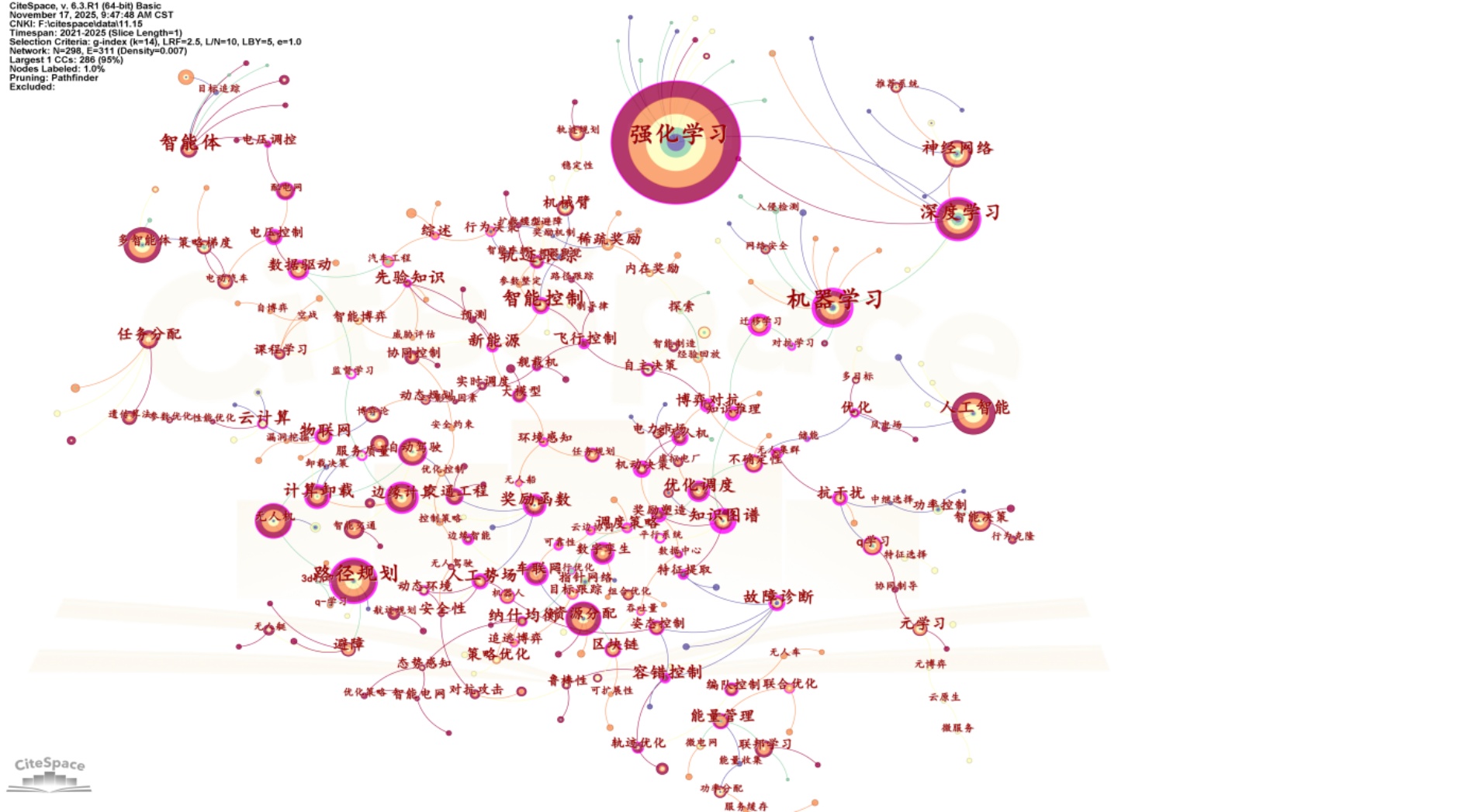 CiteSpace作为知识图谱分析的主流工具,可通过挖掘文献关键词共现、聚类、突现等潜在关联,以可视化形式呈现研究领域的发展脉络[7]。该工具已被广泛应用于人工智能领域的学术计量研究,王鹏等人基于CiteSpace梳理了我国人工智能高质量数据集的研究趋势和热点方向[8];陈伊高等人借助其梳理人工智能技术与出版深度融合的趋势[9]。吴岩等采用CiteSpace的可视化分析,揭示配电网韧性研究领域的研究动向[10]。基于此,以2021~2025年中国知网核心期刊5099篇“强化学习”主题文献为对象,通过CiteSpace展开多维度可视化分析,旨在系统揭示该时期内强化学习算法的研究热点、前沿动态与机构合作特征,为科研人员选择研究方向、开展跨领域合作提供清晰的学术图景,同时为强化学习技术的产业化应用提供理论支撑。