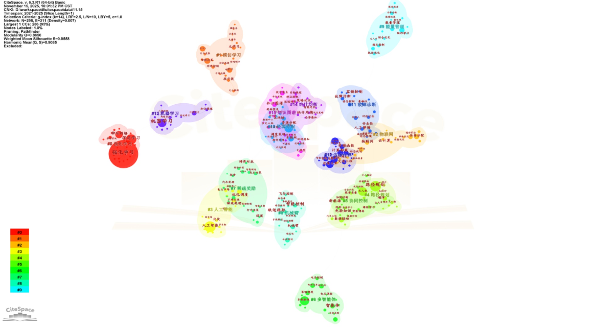 表中,“聚类编号”是系统自动生成的聚类标识,用于区分不同研究专题;“聚类大小”指聚类包含的成员数量,规模越大通常代表该主题越核心;“轮廓值”衡量聚类内部一致性与类间区分度,大于0.7则聚类质量较高;“聚类高频关键词”是聚类中权重最高的词汇,体现研究重点;“平均发表年份”反映主题首次出现或活跃的时间。通过对表2分析,2021~2025年强化学习算法研究形成16个有效聚类,这些聚类可划分为四类:一是基础算法类(强化学习、模拟学习、稀疏奖励),聚焦强化学习与深度学习融合、经典算法改进等底层技术创新,为领域发展筑牢根基;二是场景应用类(人工智能、路径规划、多智能体、机械臂、能量管理、资源分配、纳什均衡),覆盖无人机、配电网、机械臂、车联网等多领域,体现技术向实体经济的深度渗透;三是支撑技术类(物联网、边缘计算、知识图谱),通过与边缘计算、数字孪生等技术融合,突破单一技术应用瓶颈;四是安全优化类(协同控制、故障诊断、机器学习),聚焦安全约束与故障应对,保障技术在关键领域的实用性。从平均发表年份看,从2021年向2023年逐步推进,清晰呈现出从基础算法探索到场景应用深化再到多技术协同创新的演进路径,整体形成“核心算法为基、场景应用为核、支撑技术为翼、安全优化为盾”的发展格局,彰显强化学习领域从技术验证向工业化、精细化应用的转型趋势。