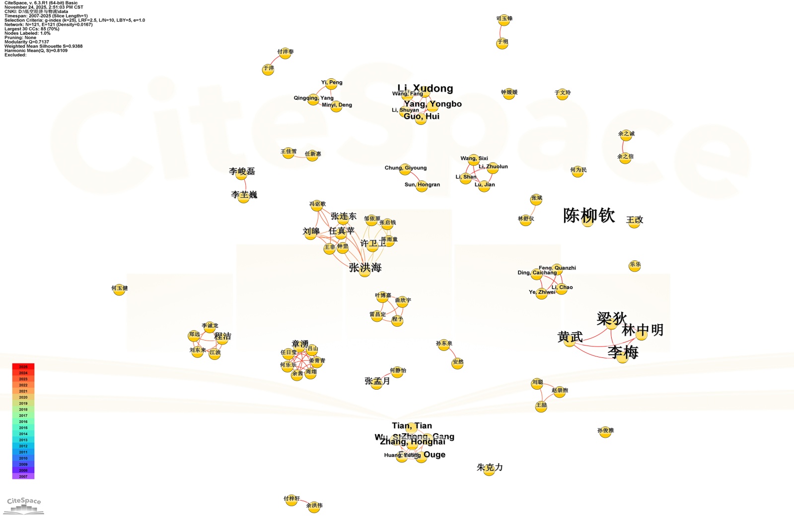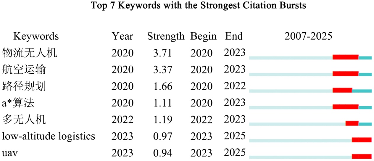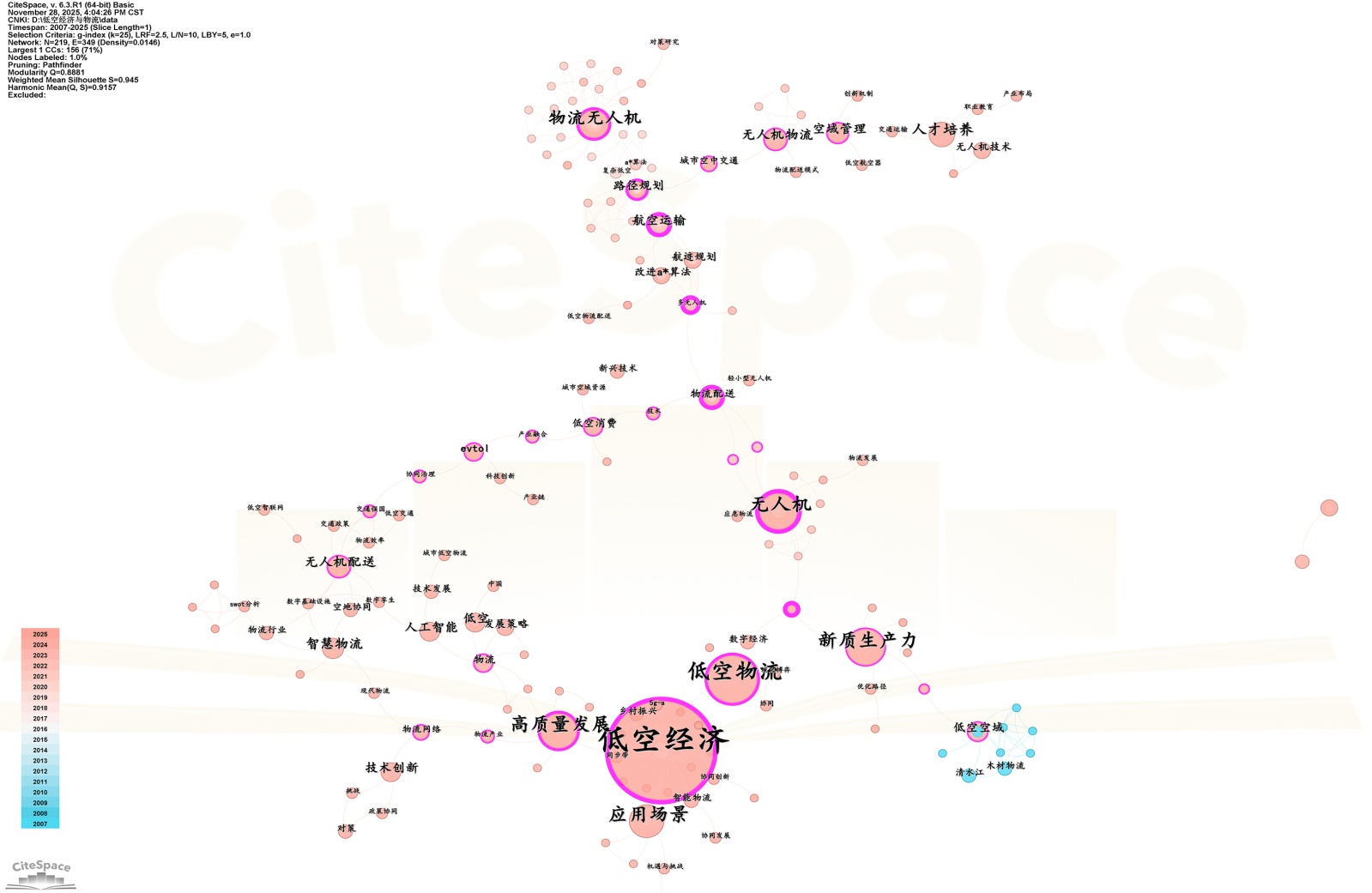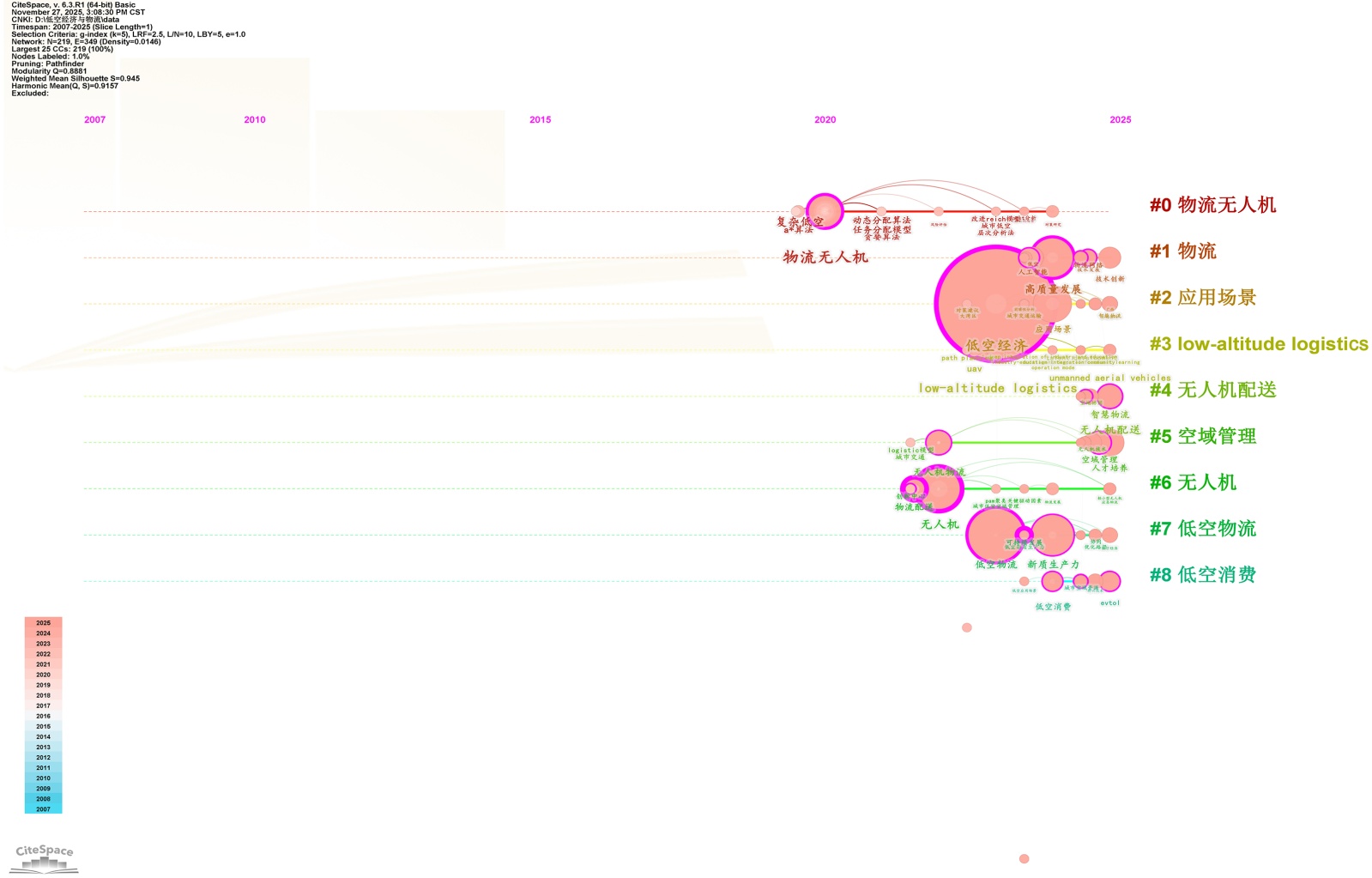 2021年,低空经济的概念首次被写入国家层面规划;2024年3月,全国两会首次将低空经济写入政府工作报告[10],报告明确提出:“积极打造生物制造、商业航天、低空经济等新增长引擎”。这一举动标志着低空经济成为国家经济发展的重点方向,进入了全面加速发展的新阶段。同时这也促进了低空物流进入飞速发展时期。本文运用CiteSpace可视化软件,针对国内低空物流领域2007~2025年的研究文献进行可视化分析,得到如下结论: