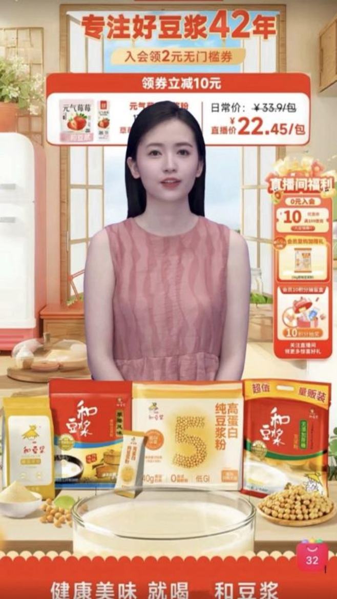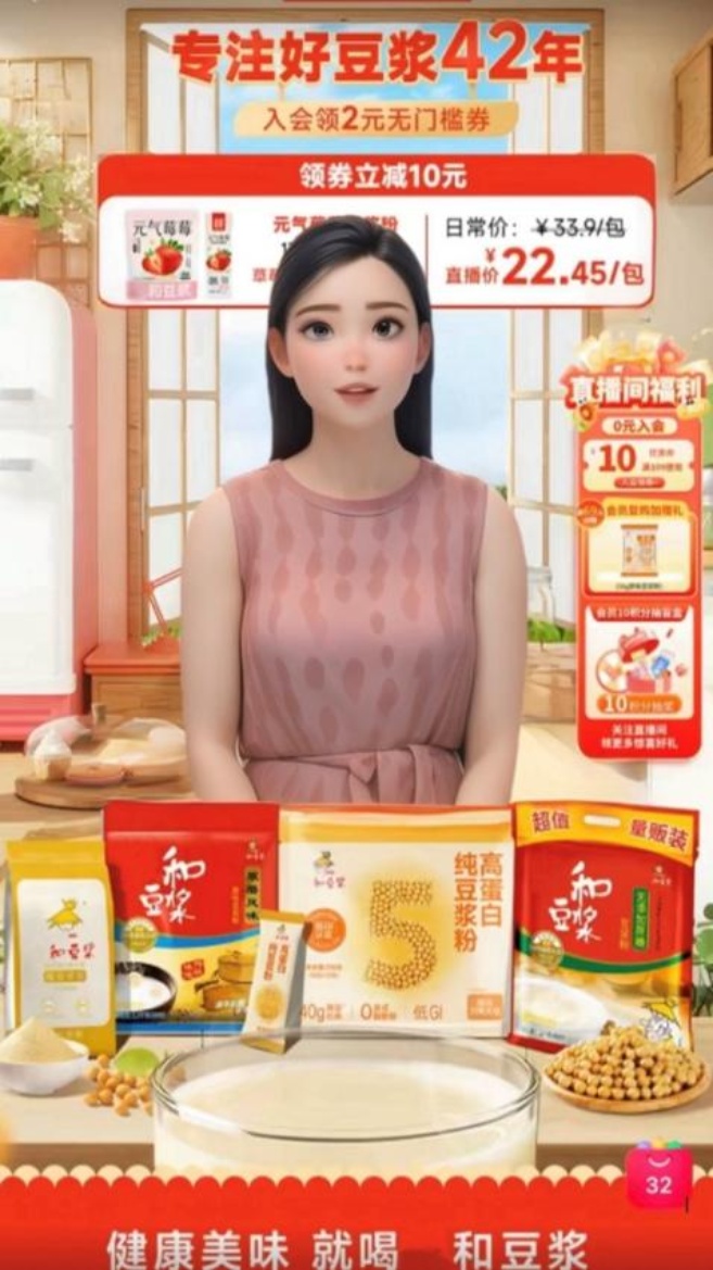 (1) 参与者首先阅读购物场景化引导语并观看情境视频,以快速进入购物状态。引导语具体为:“请想象:你计划购买‘豆浆粉’,进入饮品专场的直播间,主播(靓靓)正在讲解该产品”,随后,参与者观看直播切片视频。高形态拟真度组主播在介绍中赋予专属名称“靓靓”,呈现高拟人3D形态,低形态拟真度组不赋予名称,采用2D卡通形象,严格保持与高形态拟真度组一致的姿势、构图及服装款式,避免在感知上引起参与者的混淆。实验所用示例图如图1所示,所有主播形象和品牌名称均为虚构,排除品牌效应干扰。
