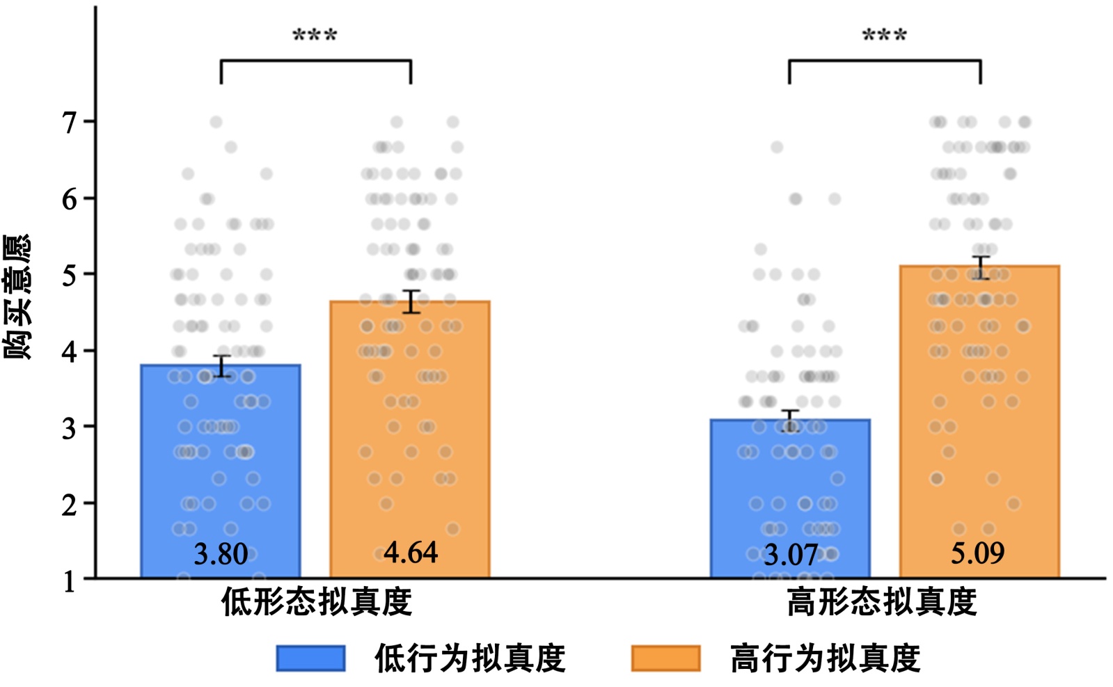 以购买意愿为因变量的双因素方差分析结果显示,行为拟真度的主效应显著(F(1, 378) = 100.11, p < 0.001),高行为组购买意愿(M = 4.86, SD = 1.44)显著高于低行为组(M = 3.44, SD = 1.41)。形态拟真度的主效应不显著(p = 0.343)。形态 × 行为拟真度交互作用显著(F(1,378) = 16.887, p < 0.001)。进一步分析交互作用发现,在低行为拟真度条件下,高形态拟真度组的购买意愿(M = 3.07, SD = 1.32)甚至略低于低形态拟真度组(M = 3.80, SD = 1.41);但在高行为拟真度条件下,高形态拟真度组的购买意愿(M = 5.09, SD = 1.40)则显著高于低形式组(M = 4.64, SD = 1.45),如图2所示,假设H1得到验证。