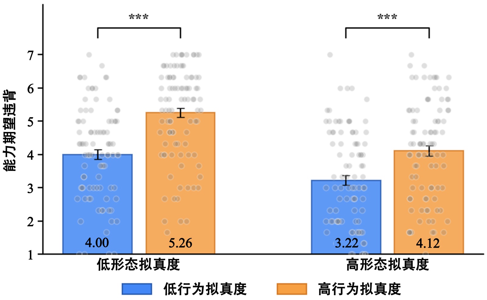 低形态 × 高行为拟真度组均值(M = 5.257, p < 0.001)显著高于中性水平,表明产生了正向能力期望违背,假设H2a成立。高形态 × 低行为拟真度组均值(M = 3.221, p < 0.001)显著低于中性水平,表明产生了负向能力期望违背,验证了假设H2b。低形态 × 低行为拟真度组(M = 3.997, p = 0.981)和高形态 × 高行为拟真度组(M = 4.118, p = 0.45)的期望违背感知均值均处于中性水平,且无显著差异,表明在拟真度匹配情境下,消费者未产生显著的能力期望违背,假设H2c成立。具体示例图如图3所示。