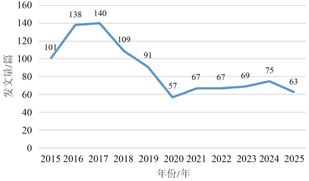 (1) 研究发展趋稳。发文量在经历早期波动后,近年来稳定在每年60~75篇左右,表明该领域已进入平稳、持续的深化研究阶段。