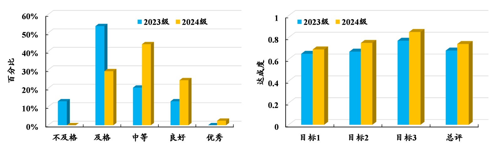 经过多轮次建设与改革,学生的学习兴趣与学习主动性明显增强,问卷调查结果显示,92%的学生认为数字化资源有效降低晶体结构学习难度,88%的学生表示课程趣味性明显增强。对比改革前后学生考核数据,3个课程目标达成度均超过了0.68,学生及格率明显提升,由改革前的87%增长至2024年的100%,优良率自13%增长至2024年的27% (图2)。同时,本课程的课程思政建设取得一定成效,现已获批重庆市课程思政示范课程。