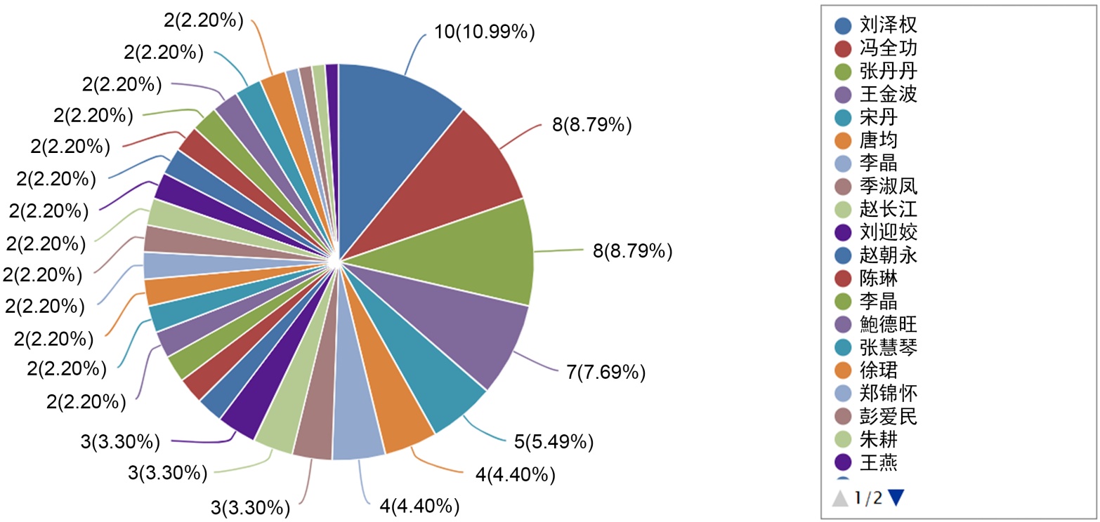 通过对作者发文量的统计,可发现排名第一的作者为刘泽权,发文10篇;排名第二的作者为冯全功和张丹丹,发文各8篇;排名第四的作者为王金波,发文7篇;排名第五的作者为宋丹,发文4篇(具体见图2)。研读发现这些发文作者的研究方向各有不同和侧重,包括并不限于平行语料库英译研究、文化英译研究、翻译对比研究、翻译规范与缺失等方向。