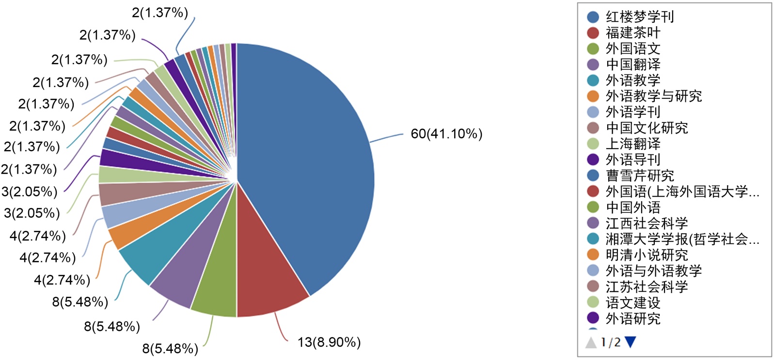 最后,从期刊分布图(图4)可知虽然各外语类期刊基本上都发表过《红楼梦》英译研究方面的文章,但主要从《红楼梦学刊》《福建茶叶》《外国语文》《中国翻译》《外语教学》《外语教学与研究》《上海翻译》《中国文化研究》《中国外语》和《外语学刊》等共计21个期刊刊载相关文章为样本予以探析。期刊分布呈现“双核心”结构,专业期刊如《中国翻译》《上海翻译》约占8%;综合期刊如《外语教学》《外国语文》约占11%;《福建茶叶》此处可能略显特殊,因《福建茶叶》与《红楼梦》英译研究的直接关联性不强,可能是个别研究涉及了茶文化等交叉领域。从研究方向的多样性可以看出,《红楼梦》英译研究正逐渐与其他学科如语言学、文化学、历史学等相结合,形成跨学科的研究趋势。这种趋势有助于拓宽研究视野,深化对《红楼梦》英译的理解。