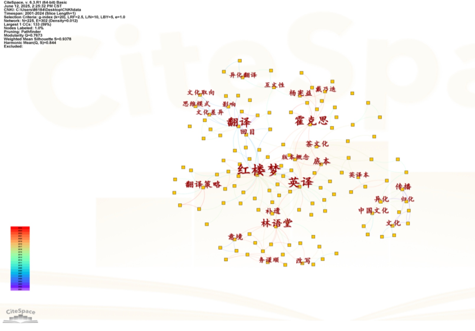 CiteSpace软件系统由陈超美博士研发,是对科学文献新趋势与新动态进行可视化识别的Java程序,已成为信息分析领域中影响力较大的可视化软件[4]。在国内学术研究中,CiteSpace广泛应用于文学翻译研究领域:中国知网涵盖了783篇聚焦中国文学译介研究的文章,研究者巧妙运用CiteSpace开展可视化分析工作,对研究涉及的年份跨度、期刊分布、作者群体、机构合作以及关键词关联等关键要素进行了全面且细致地剖析。通过对这些可视化结果的解读,不仅能够准确地把握该领域的研究热点和发展脉络,还揭示了中国文学翻译研究中潜藏的一系列问题,如研究视角的局限性、研究方法的单一性等。这表明CiteSpace在文学翻译研究领域具有通用性和有效性,能够帮助研究者梳理研究重点和发展前沿,为相关领域的发展提供参考。在《红楼梦》英译研究中,我们可以借鉴这些类似研究的方法和经验,进一步深入挖掘《红楼梦》英译研究中的潜在信息和规律。本文将运用CiteSpace工具,采用文献计量分析法,呈现相关文献论文中citespace英译研究的热点话题和趋势。