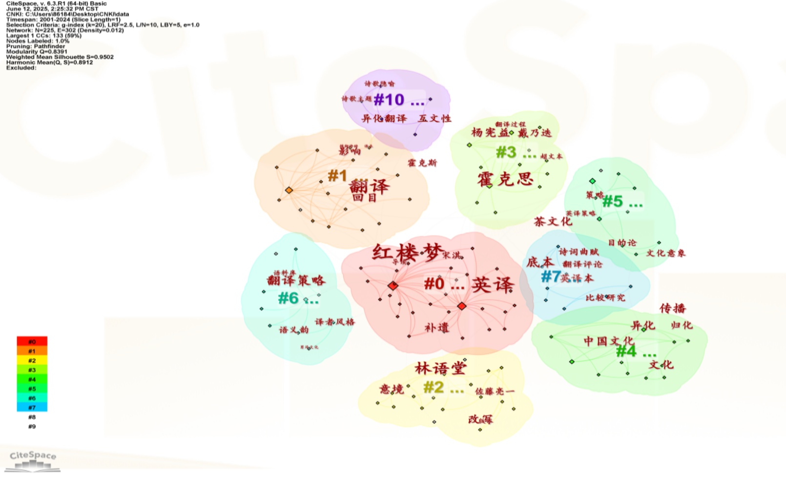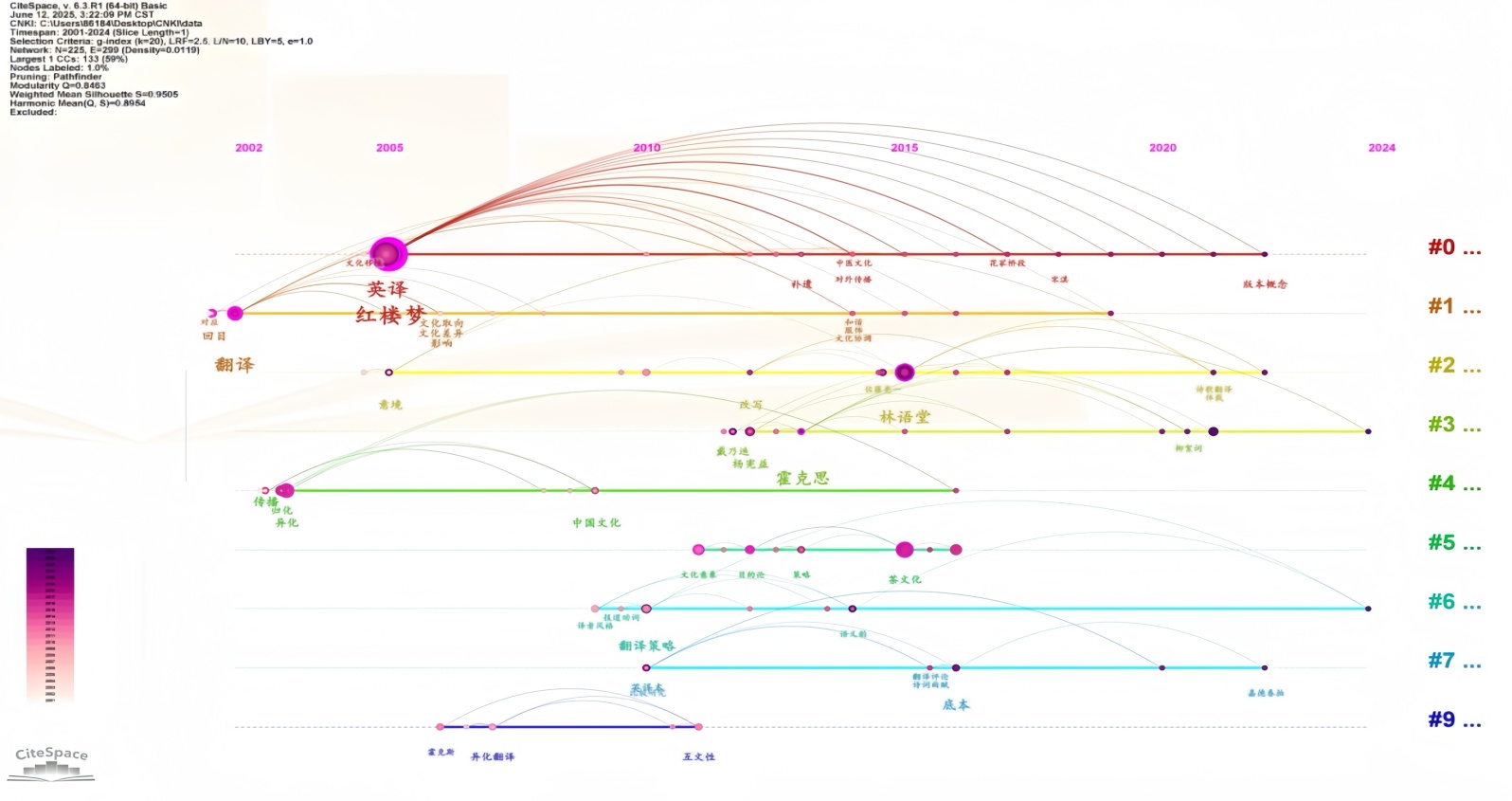 经CiteSpace操作运行后,在关键词共现图谱和聚类图谱基础上进行Timeline View分析得到时间线图谱(如图7),展现了更丰富的以聚类为基础的研究主题的历时性变化。网络同质性评价指标(Silhouette,S值)为0.9505 (S > 0.5),表明该聚类结果显著,聚类效果较为合理。时间线图谱共有9个突现热点关键词。通过前文的总结,结合分析研究热点时间线图谱、关键词突现检测图,其过程可分为三个阶段。2000年~2010年可视为研究的发端期,这一阶段的研究主要聚焦于《红楼梦》英译本的翻译,如霍克斯和杨宪益夫妇的经典译本对比,重点从归化和异化策略进行探讨,探讨不同翻译策略的优劣;此阶段的研究为后续的深入研究奠定了基础,提供了丰富的译本资源和初步的分析框架。2010年~2020年随着翻译理论和技术的发展,研究呈现多元化趋势。对多个《红楼梦》英译本进行系统的对比分析,探讨不同译者在处理文化特色词汇、隐喻、诗词等方面的异同。此外也对《红楼梦》英译本的翻译角度、方法等进行多方面探讨,如对杨宪益和霍克思译本的探析、对中医文化、茶文化进行分析、以多样的翻译理论和翻译策略方法进行探讨,丰富多样;此阶段的研究在前期的基础上进一步深化,对翻译策略、文化因素等方面进行了更深入的探讨。此外研究方法多样,包括定性研究、定量研究、共时比较研究等;研究视角也呈现多样化趋势,如文化视角、美学视角等。2020年~2025年的研究有所减少,分析角度也较少,更注重翻译技术的应用和跨文化传播的深化。这阶段较关注《红楼梦》英译在跨文化交流中的作用和效果,探讨如何通过翻译促进中国文化的国际传播。