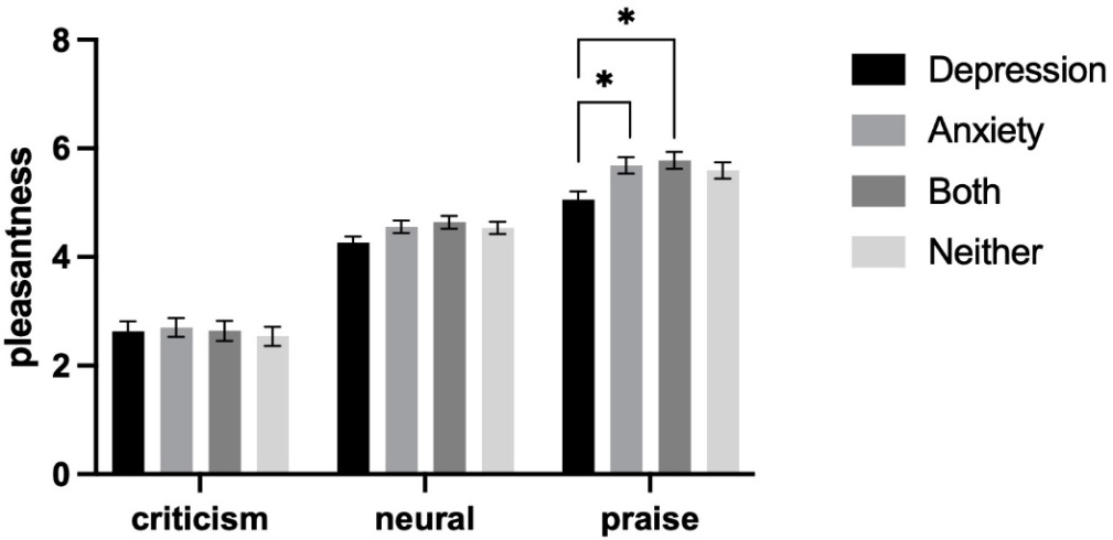 本研究从心理语言学视角考察了不同情绪症状群体对自我相关评价性言语的接收差异。结果表明,抑郁倾向个体表现出对指责的过度内化与对称赞的系统性拒绝,而焦虑倾向个体在缺乏现实社交威胁的语境下仍能正常接收称赞。共病个体则呈现出焦虑对抑郁认知特征的部分遮蔽效应。研究提示,对称赞真实性的否定可能构成抑郁的关键心理语言学标记,为区分抑郁与焦虑及其早期识别提供了新的行为学视角。