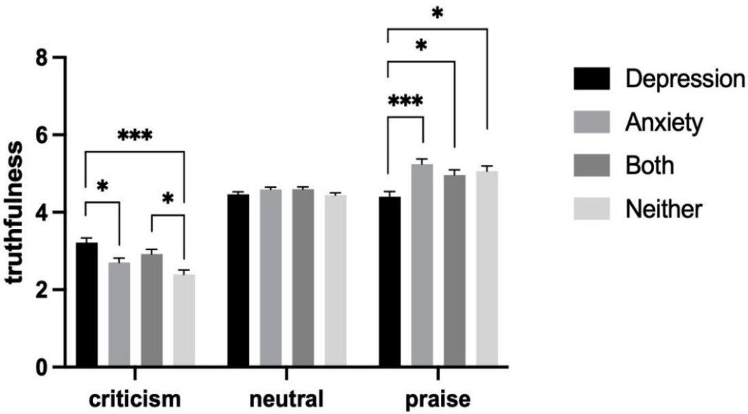 本研究基于言语评价加工视角,考察了不同情绪症状群体对自我相关称赞与指责的情感反应与认知判断差异。结果表明,在总体层面上,所有被试均能区分评价语的情感效价,表现为称赞最为愉悦、最具真实性,指责最低,中性评价居中。这一模式与既有关于评价性言语理解的研究结果一致[23],说明实验材料与任务在语用和情感层面具有良好的效度。更为关键的是,不同症状群体在评价接受方式上呈现出系统性分化,尤其体现在抑郁与焦虑两类症状对称赞和指责的不同加工路径上。