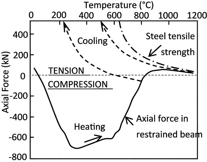 Figure 1. The change of axial internal forces of a connection in fire conditions. (A) Strong axial restraint; (B) Axially ductile connections