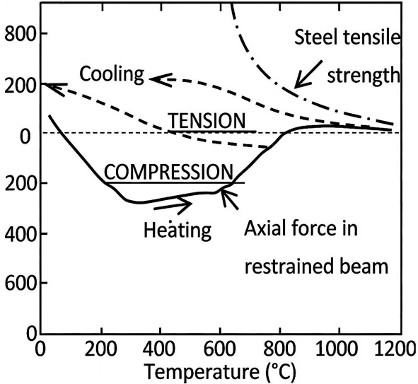 钢是一种高度依赖温度的材料。钢的屈服强度和弹性模量在400℃时开始急剧下降,800℃加热后的残余强度仅为常温强度的11%。此外,钢具有很高的导热系数,这导致其温度迅速上升。钢构件的热膨胀也会对相邻的结构构件产生压力。在火灾事件的初始阶段,由于受约束的自由热膨胀,梁在其连接上施加轴向力。随着温度的进一步升高,梁失去了大部分的抗弯能力,连接受到梁的悬链线作用所产生的拉力。显然,结构需要具有高延性的连接,以保持其在火灾条件下的完整性和稳定性。因此,设计合适的延性连接方案主要取决于所需的延性程度。在火灾的早期阶段通常是当梁的温度低于大约600℃时连接应该能够容纳连接的梁的热膨胀,以及梁端转动和梁挠度引起的缩短。这减少了传递到相邻结构的力,并防止在压缩下连接断裂。连接受相邻结构构件的约束。在火灾的初始阶段,梁的自由热膨胀受到限制,对其连接接头施加轴向压力。随着温度的进一步升高,梁的抗弯能力大大耗尽,梁的悬链线作用将在节点上产生轴向拉力。图1说明了作用在连接件上的轴向内力的这种变化。图1(A)和图1(B)的不同之处在于,图1(B)中梁的自由热膨胀是由韧性边界条件调节的,因此图1(B)中产生的压力和拉力都比图1(A)中的要小得多。