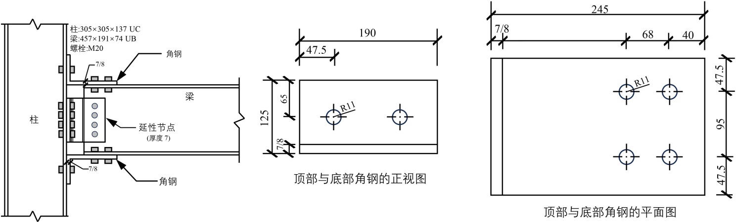 为了在满足梁的延性要求的同时兼顾结构的简单性,本研究提出了如图2所示的连接形式。这种新型连接形式的延性半椭圆截面将容纳连接梁在高温下的大挠度,从而显著降低连接中的轴向力。目前,翅片和端板连接因其成本低、易于安装的优点而在建筑业中被广泛采用。该新型连接件包括两个相同的部件,它们可以被归类为异型腹板。每个夹紧部件由三部分组成:螺栓固定在梁腹板上的翼板;通过螺栓固定在柱腹板或翼缘上的端板;以及位于肋板和端板之间的半椭圆形部分。这些异型楔形可以通过钢板弯曲来制造。另一种制造方法是将两块钢板焊接到半椭圆形的管状截面上;然而,这种方法与更高的成本和更复杂的程序相关,因此不是首选方案。半椭圆形截面是提供所需拉压延性的核心部件:它使翅片能够朝向或远离端板,从而适应连接的梁的热膨胀和悬链线作用。这可确保连接在梁温度升高和应力状态变化时保持其功能完整性。建议的设计允许连接承受相当大的拉伸和压缩变形,同时将可能引发渐进性坍塌的脆性破坏模式的风险降至最低。将角钢整合到延性节点中后,角钢可以直接承担梁端的部分竖向剪力,从而减少了半椭圆截面上的剪应力集中,防止了半椭圆截面的过早剪切破坏。在火灾或地震作用下,当梁进入接触网作用阶段时,会产生较大的拉力。凭借其面内拉伸性能,角钢可以帮助该半椭圆截面在承受拉力的同时,提高了节点的极限抗拉承载能力。
