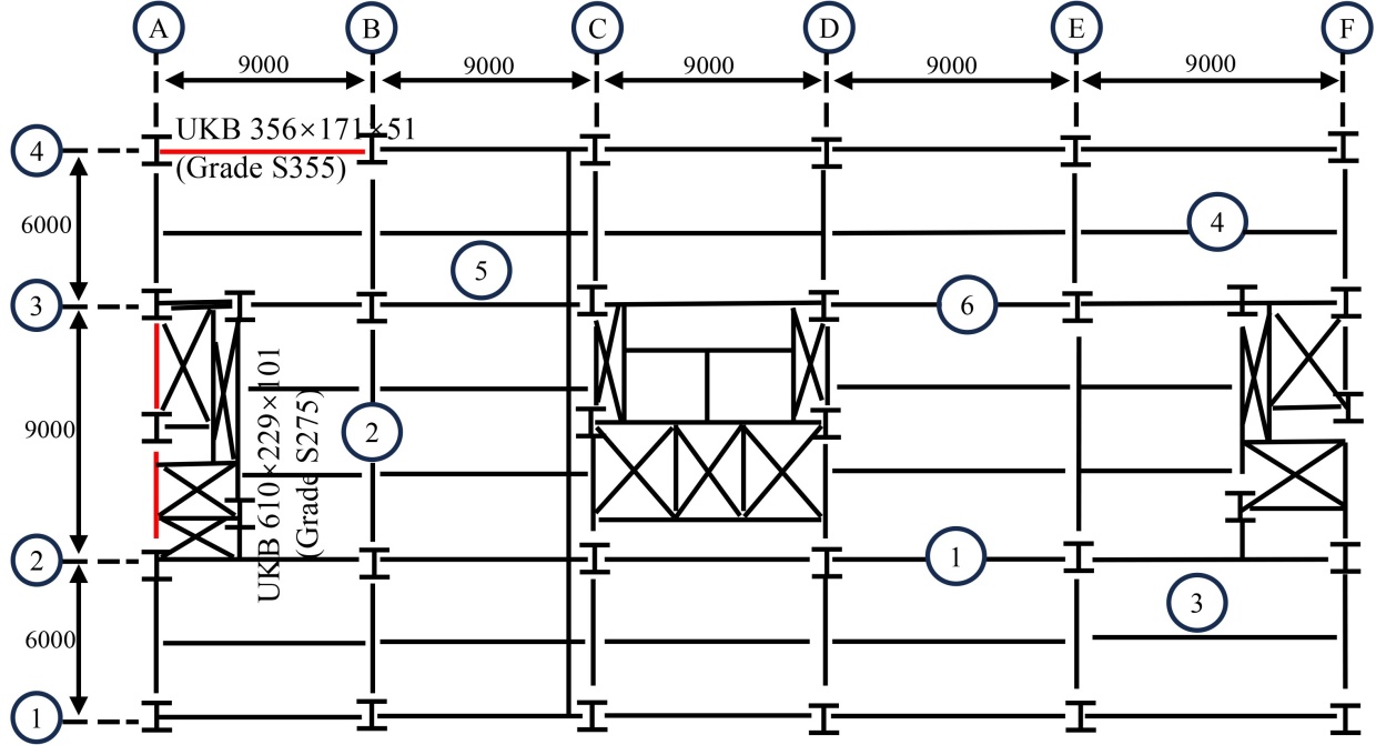 在火灾事件中,连接所承受的轴向力、剪切力和弯矩的复杂组合无法通过对孤立构件的实验准确复制。相比之下,有限元分析(FEA)作为一种稳健可靠的技术出现,用于研究材料退化、热膨胀和复杂荷载条件下的连接行为。本研究采用符合钢材高温性能退化规律的ISO834标准火灾曲线,具有国际公认的普适性和规范性适用性,能够准确捕捉火灾条件下钢节点力学行为从热膨胀约束到接触网作用的全过程。Wang [6]建立了一个三维有限元(FE)热模型,用于预测火灾下组合节点中各组件的温度分布,并建立了相应的二维有限元力学模型,用于分析组合节点在高温下的力学行为。Al-Jabri [7]利用通用有限元软件ABAQUS对两个复合材料十字形柔性端板节点在火灾暴露过程中的高温力学响应进行了详尽的数值研究。赵[8]建立了一个专门的程序,利用该程序对两个复合材料十字形柔性端板节点在火灾下的高温力学响应在已有的纤维梁柱模型采用基于构件的方法进行了研究,可以对半刚性连接的组合结构进行复杂的非线性分析。在基于框架的有限元分析中,结合了精细的节点建模,需要密集的单元网格来全面地捕捉连接细节。这种方法能够精确地集成几何特征、依赖于温度的材料特性、连接界面处的接触行为以及相邻结构组件之间的交互效果。因此,分析结果能够真实地反映节点在临界区域内的变形特征和应力应变的空间分布,椭圆形截面应能够容纳连接梁在低温和高温范围内的火灾变形。从卡丁顿全尺寸火灾试验[9] [10]中采用的典型钢框架模型如图3所示,配备了两种类型的节点。建立了相应的有限元模型(FEMS)来模拟结构的耐火和抗震性能,其详细尺寸如表1所示。