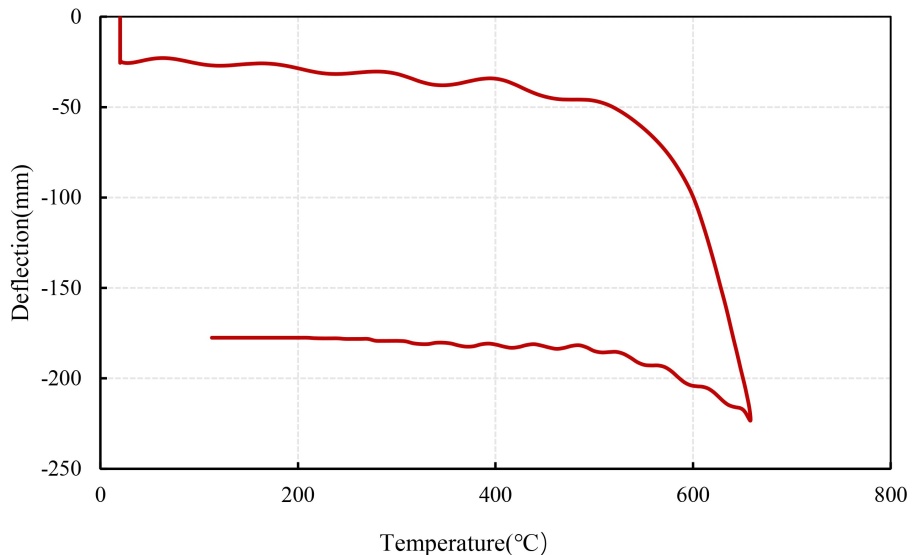 图4和图5所示的模拟结果表明,梁的热膨胀在初始加热阶段受到约束,在连接处产生轴向压力;随着温度的升高,压力逐渐降低。梁进入悬链线状态后,轴力转换为拉力。在冷却阶段,钢材的强度和刚度有一定程度的恢复,而梁的收缩,导致拉力略有增加,可能导致连接失效。图4(A)和图5(A)中梁跨中挠度的略微减小也证实了这一现象。在原型1的加热阶段,梁的挠度基本稳定在−50 mm到200 mm的范围内,显示了半椭圆截面的初始变形协调能力。然而,当温度超过600℃时,挠度会急剧下降到−250 mm以下。在高温下,半椭圆截面的材料性能急剧退化,不再能够约束梁的变形,从而导致梁端破坏。对于原型2,在600℃时挠度达到−800 mm,是无角钢连接的四倍(−200 mm)。假设两个节点都以均温分布,角钢节点由于螺栓被拔出,导致了挠度的增加大于无角钢节点,角钢也在一定程度上保护了延性节点。这种现象突出了角钢的延性优势,更符合结构在火灾条件下的抗灾要求。在轴力性能方面,值得欣慰的是,角钢的加入提高了节点的抗压能力。这使得连接件能够承受更大的热膨胀诱导压力,从而防止半椭圆形部分过早进入塑性阶段。在高温下,角钢承担了部分拉力,减小了半椭圆截面上的拉伸载荷,使轴力的变化更加平缓,避免了应力集中导致的脆性断裂。将角钢集成到椭圆形延性连接中,通过扩大变形范围和优化传力路径来改善其延性。图6显示了ABAQUS中两种延性连接的变形等值线图。